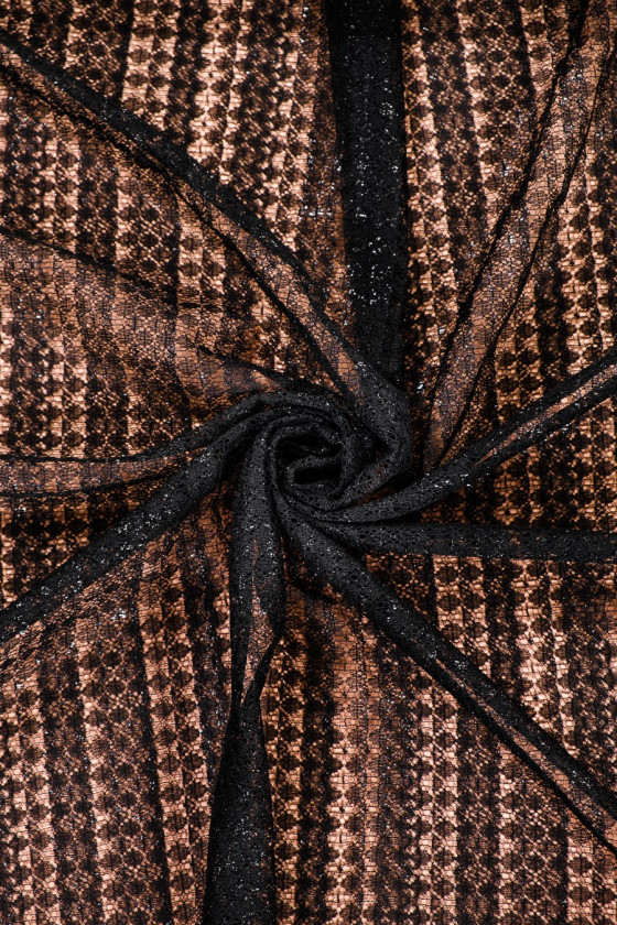 Smuk fransk blonder i sort med skinnende lurex tråd. Tæt motiv af lodrette striber - blonderne har ingen dekorativ tand. Stoffet er 88 cm bredt.