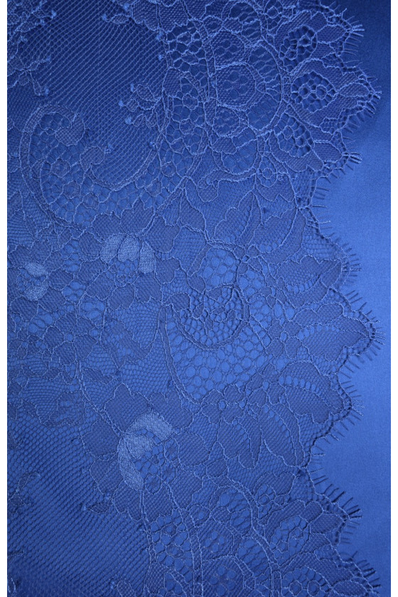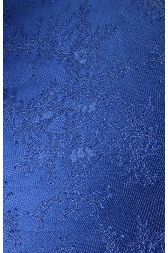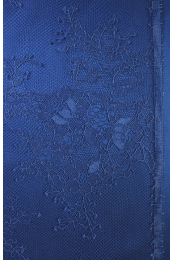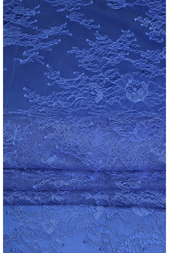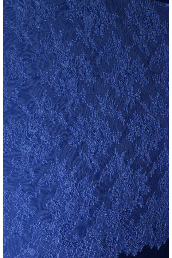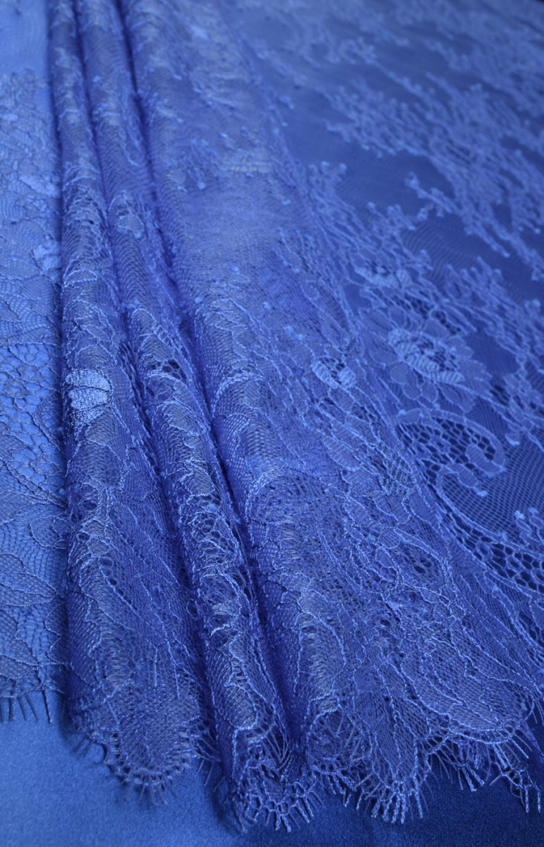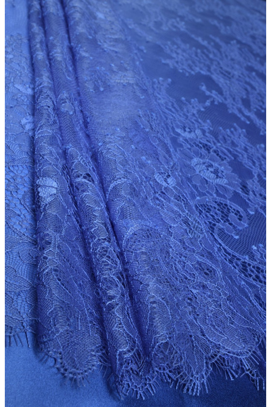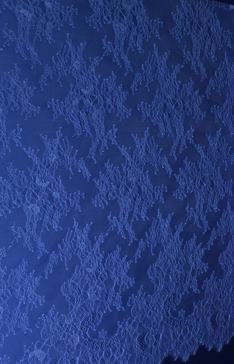 Tynde, delikate franske blonder i kornblomstblå. Perfekt til bluser eller kjoler. Smalt stof 70cm.
