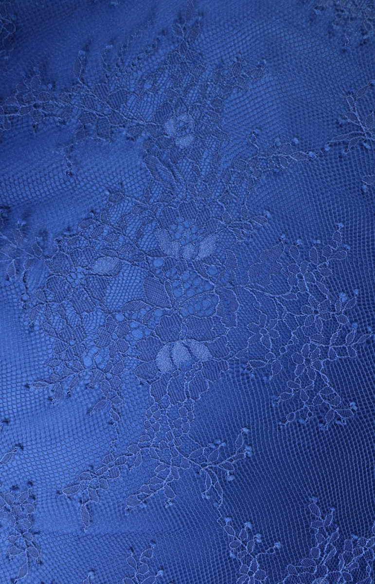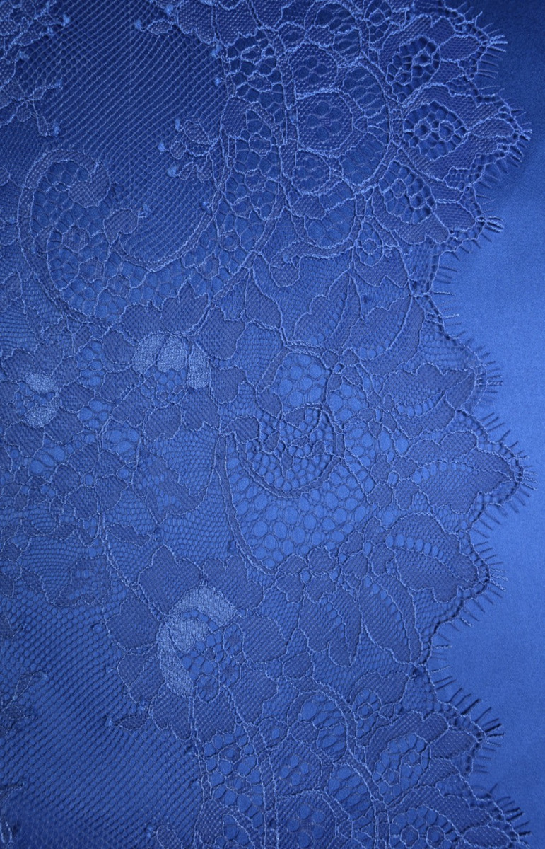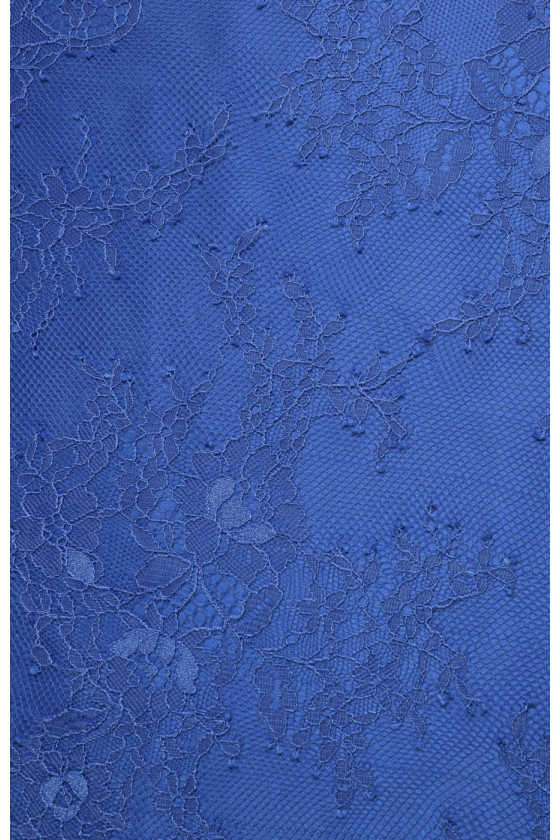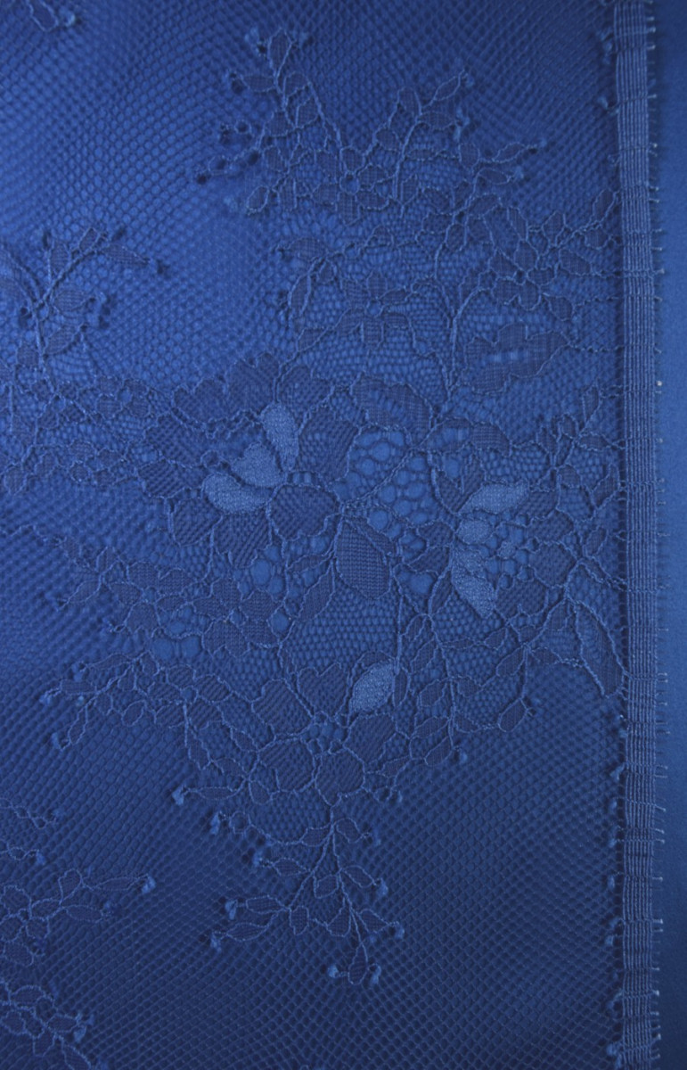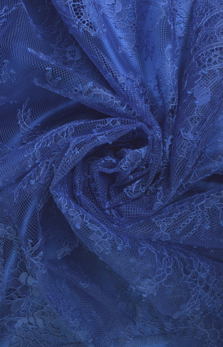 Tynde, delikate franske blonder i kornblomstblå. Perfekt til bluser eller kjoler. Smalt stof 70cm.