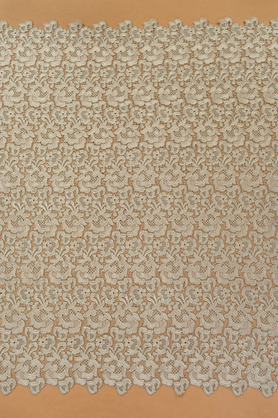 Gupure blonder med et klassisk blomstermønster i kold beige farve. For en smuk effekt anbefaler vi at vælge et for, f.eks. lavet af silkesatin.