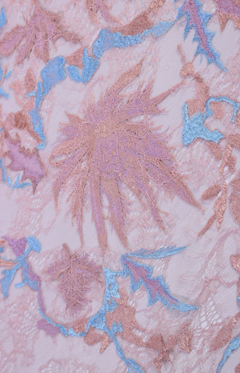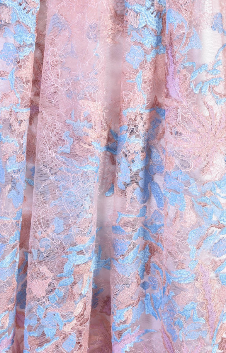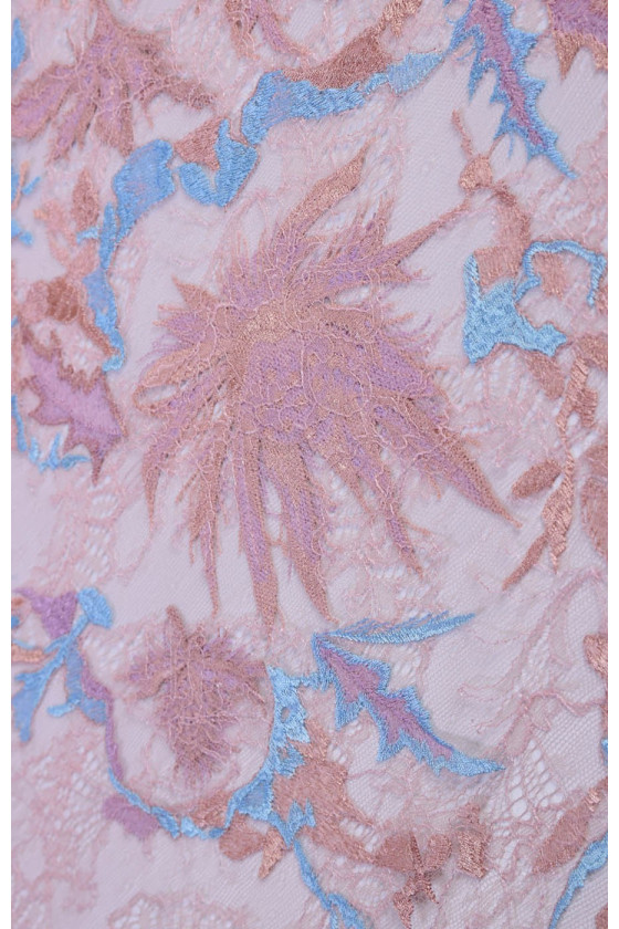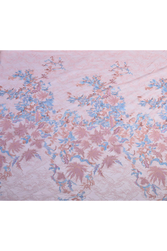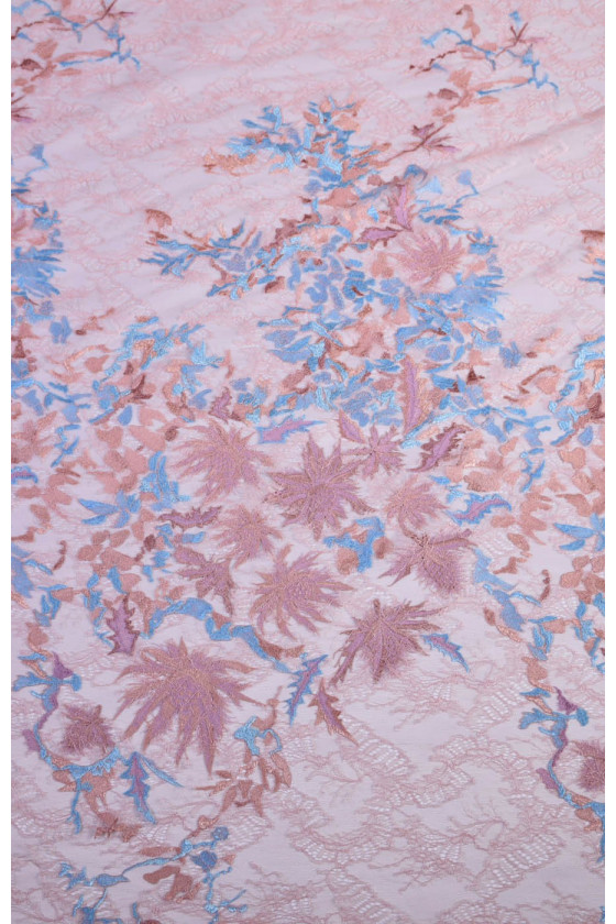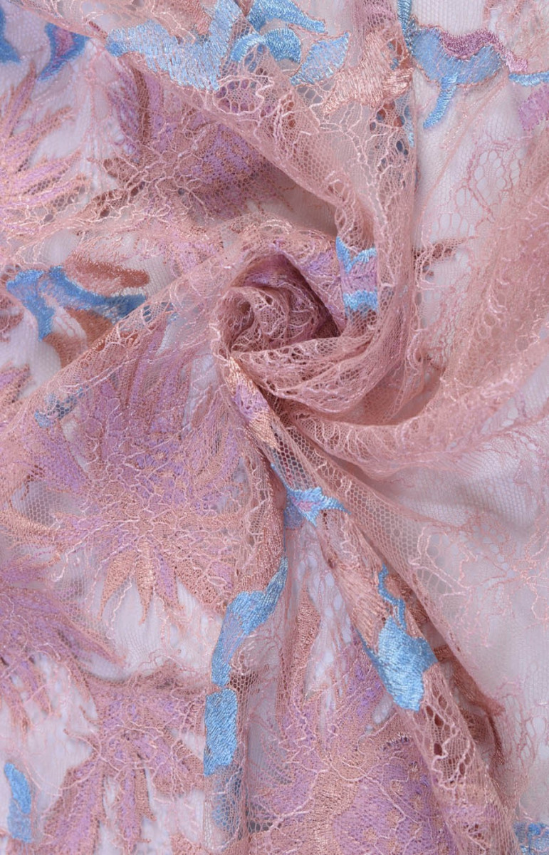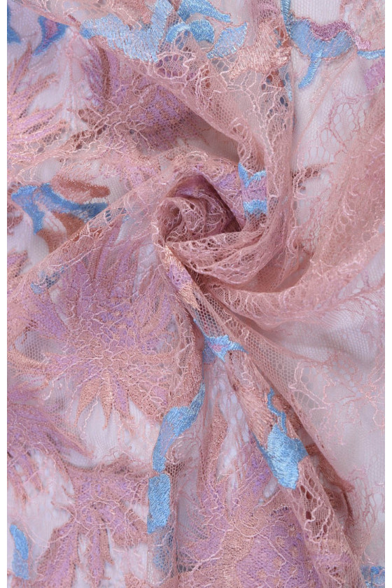 Smukke blonder i pudderrosa og blå med broderi, der skaber en 3D-effekt. Stof 140 cm bredt. Det er blødt og delikat. Perfekt til kjoler eller bluser.