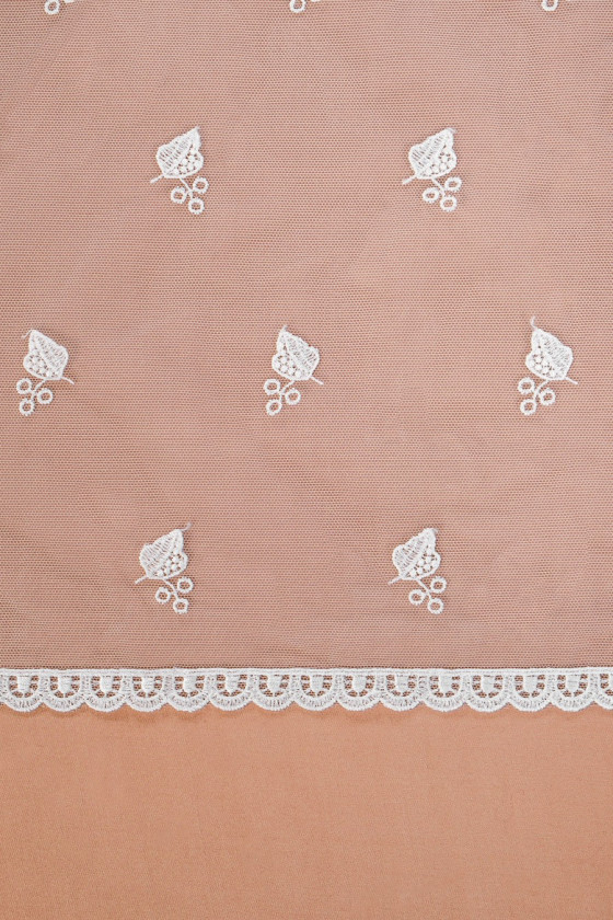 Smuk blonder til brudekjoler eller bluser. Stoffet er færdig på den ene side med en bred tand og på den anden side trimmet med en 1 cm finish.