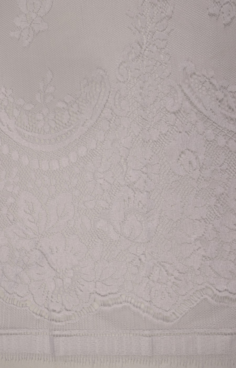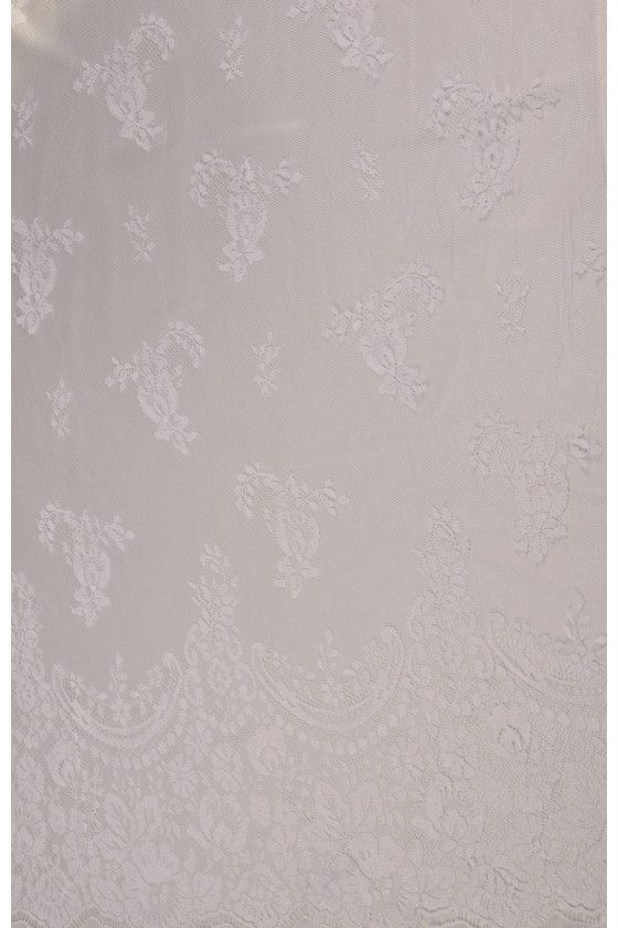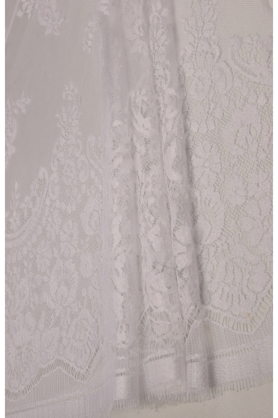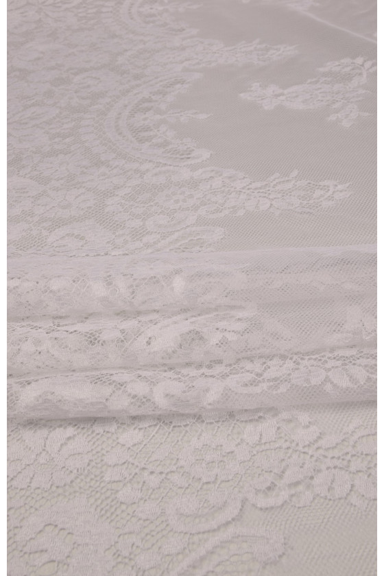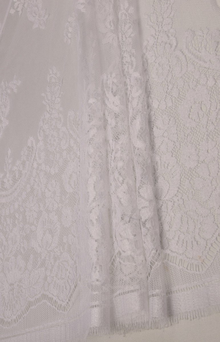 Den sidste kupon med dimensioner på 150 cm * 100 cm bryllupsblonder i hvid cremefarve, afsluttet med en tand på begge sider (i bunden er tandbredden ca. 25 cm). Blonderne er delikate, bløde at røre ved.