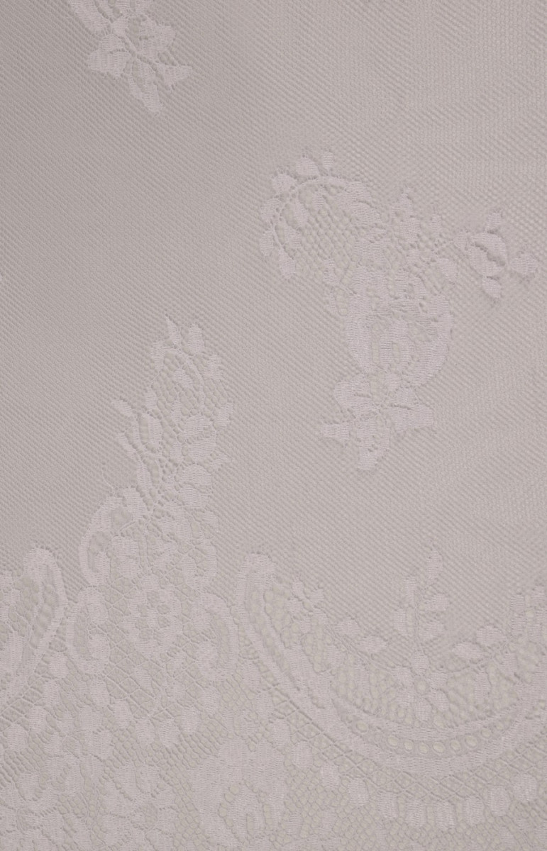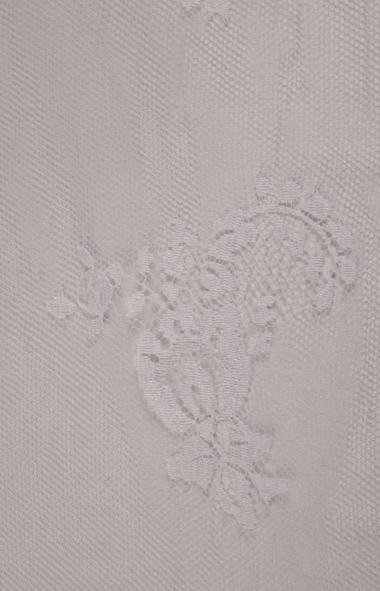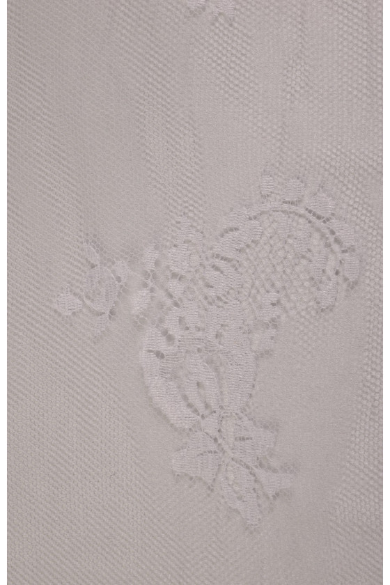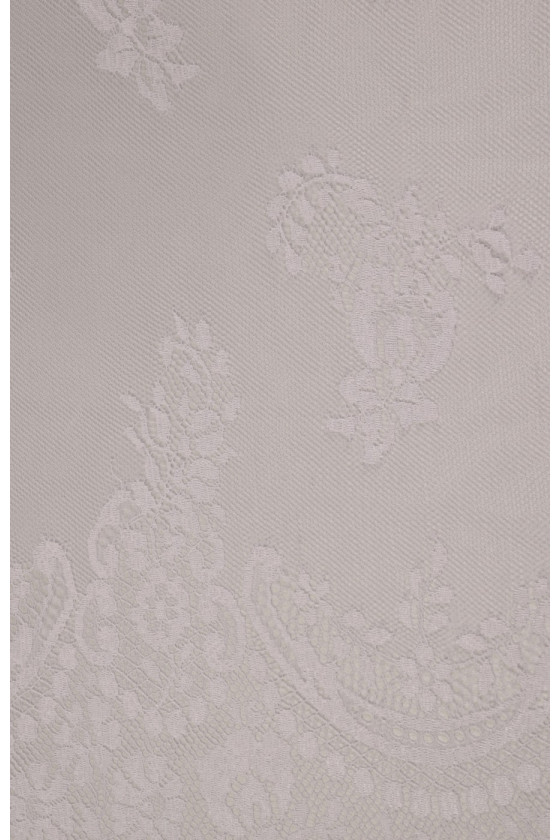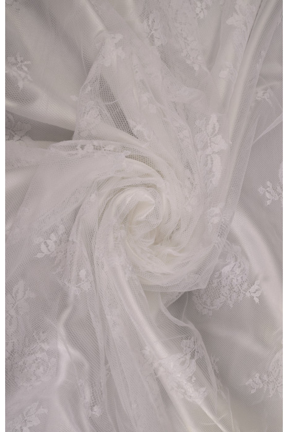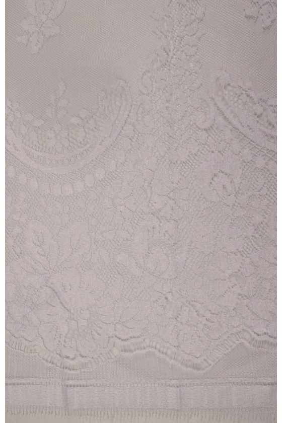 Den sidste kupon med dimensioner på 150 cm * 100 cm bryllupsblonder i hvid cremefarve, afsluttet med en tand på begge sider (i bunden er tandbredden ca. 25 cm). Blonderne er delikate, bløde at røre ved.
