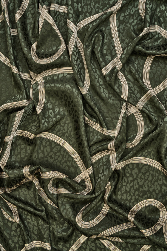 Italiensk polyesterstof med bånd og leopardprint motiv på en grøn flaskebaggrund. Jacquard leopard print mønster lavet i en satinvævning. De lyse beige bånd er 13 mm brede. Stoffet er let, luftigt, elastisk, tyndt, men uigennemsigtigt. Et meget interessant forslag, der vil se smukt ud i en syet kjole, nederdel samt en bluse eller skjorte.