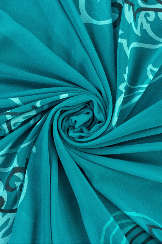 Polyesterchiffon fra en berømt modedesigner. Et moderigtigt, orientalsk motiv i sort på en havgrøn baggrund. Stoffet er ikke-elastisk, let, luftigt, gennemsigtigt. Perfekt til syning af en bluse, kjole, nederdel. Den leveres i en kupon med dimensioner på 120 cm * 145 cm. Farver: havgrøn, sort