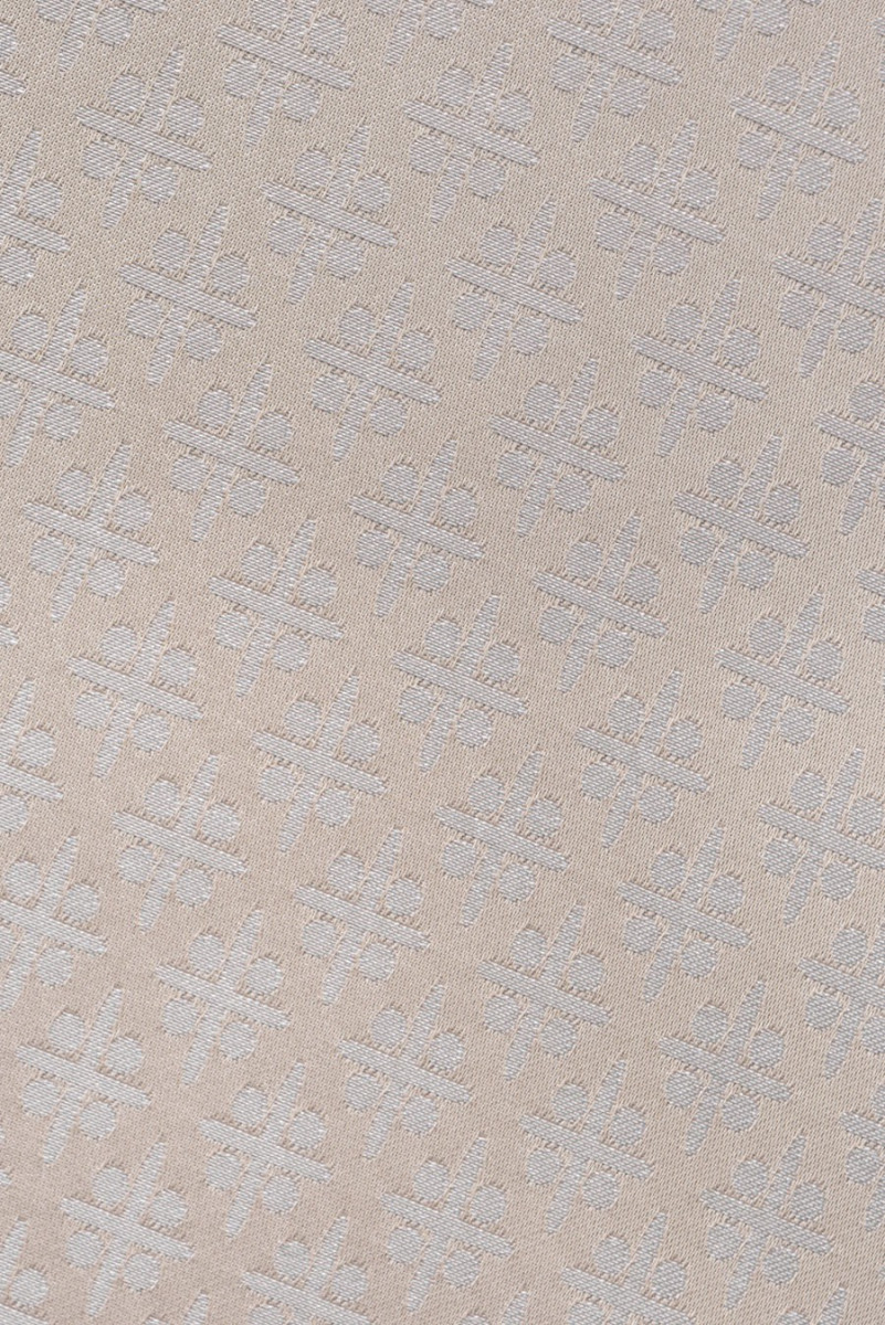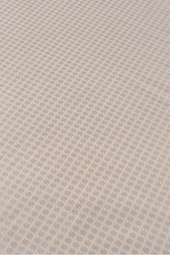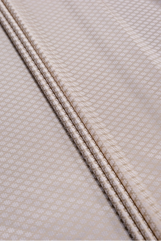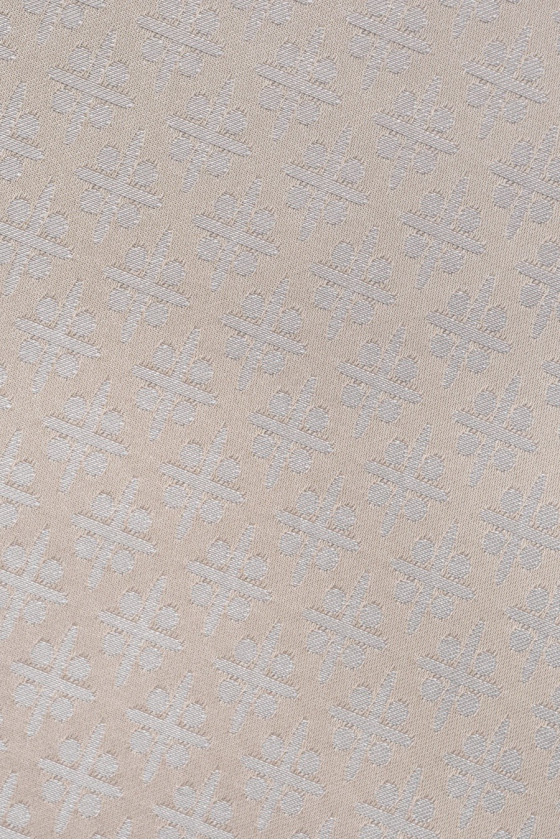 Italiensk polyesterstof med jacquardvævning - et meget tæt motiv af mønstre på ca. 1 cm i størrelse. Baggrunden er beige, mat og mønstrene er satin, til gengæld har vi det modsatte - baggrunden er satin og mønsteret er mat. Stoffet er tyndt, ikke-elastisk, let stift - det kan sys på begge sider.