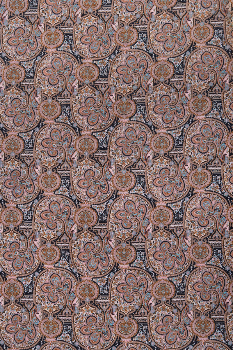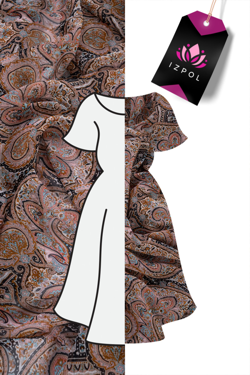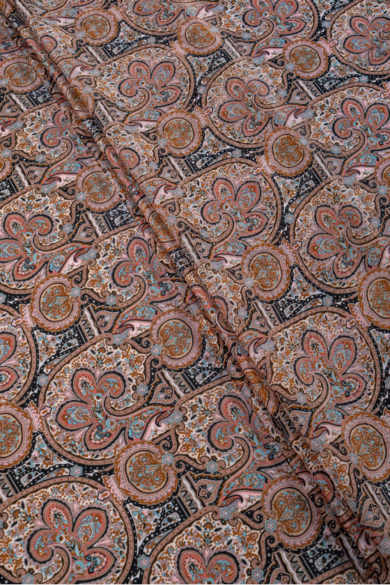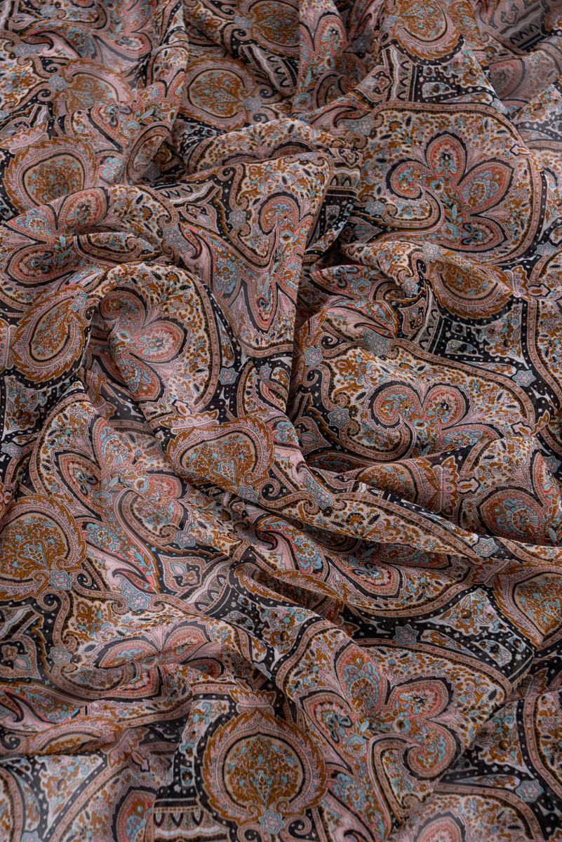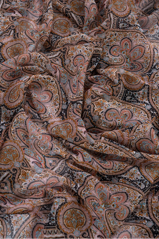 Italiensk polyesterchiffon med orientalsk motiv i sorte og beige farver med elementer af turkis og lyserød. Chiffon er et meget delikat, luftigt, gennemsigtigt stof med en delikat, krøllet tekstur.