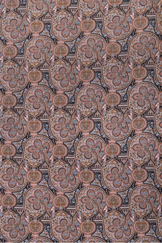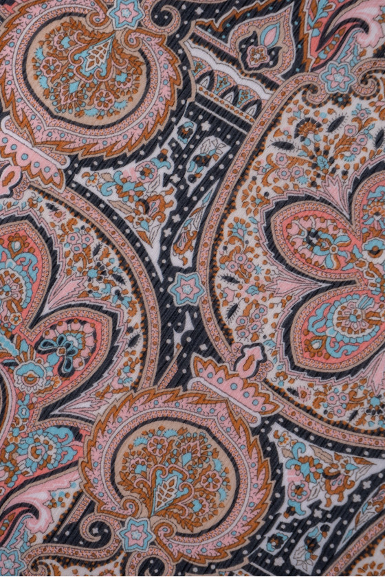 Italiensk polyesterchiffon med orientalsk motiv i sorte og beige farver med elementer af turkis og lyserød. Chiffon er et meget delikat, luftigt, gennemsigtigt stof med en delikat, krøllet tekstur. Perfekt til luftige kjoler, bluser eller nederdele.