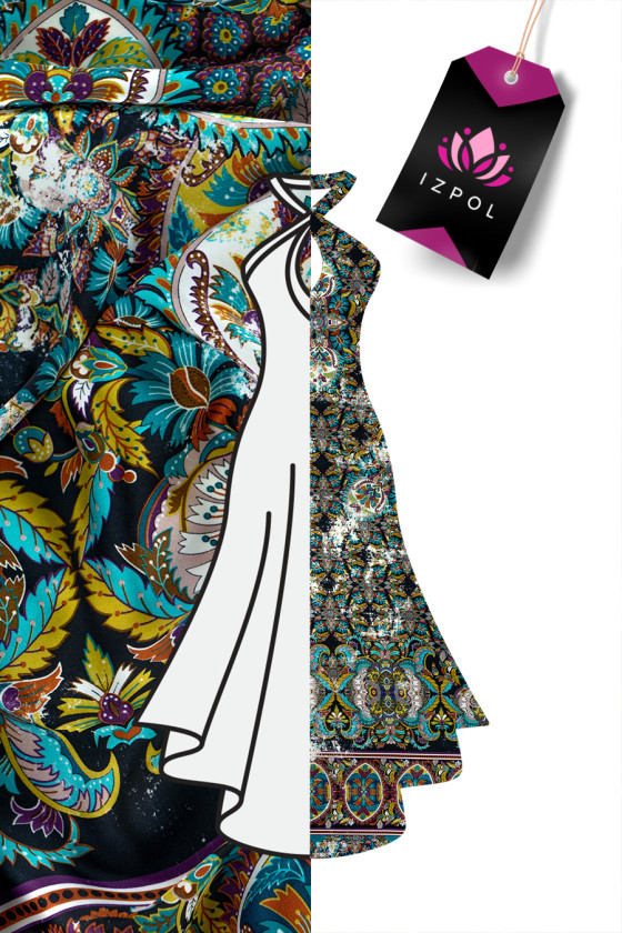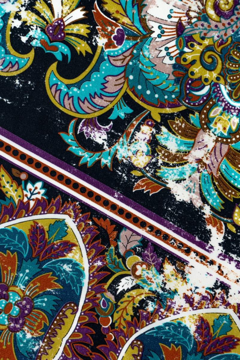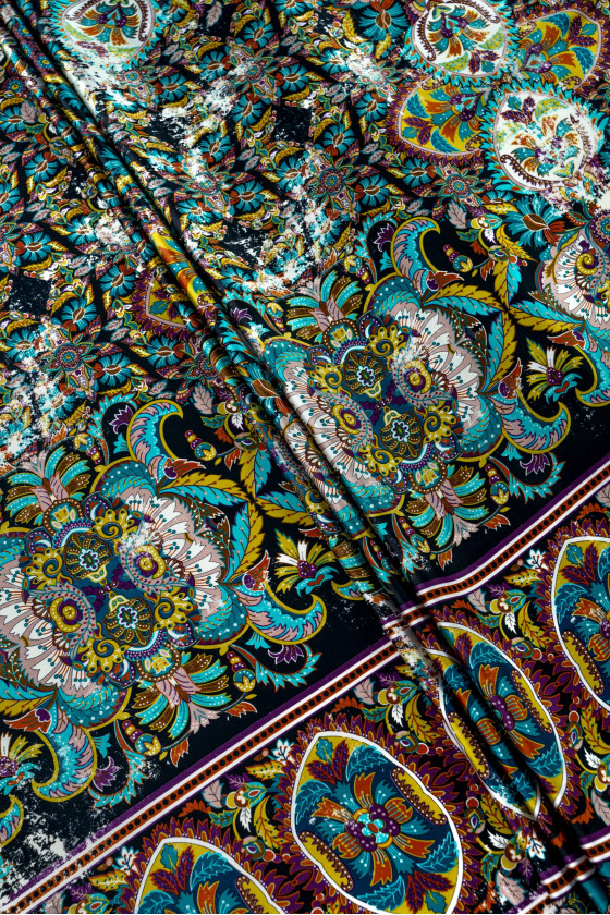 Italiensk polyestersatin i sort med et tæt, farverigt orientalsk motiv. Stoffet langs den ene kant er færdig med en dekorativ kant 18 cm bred - vi syr den omkreds. Satin er et tæt og let stof med en flad overflade, lavet i en satinvævning. En yderligere fordel er dens glathed og holdbarhed, samt det faktum, at det passer meget godt, ikke viser sig igennem og er behageligt at røre ved. På den ene side er den mat, og på den anden side er den ædelt skinnende. Det kan bruges til at fremtrylle luftige kjoler, sarte bluser, nederdele, tørklæder, tørklæder.