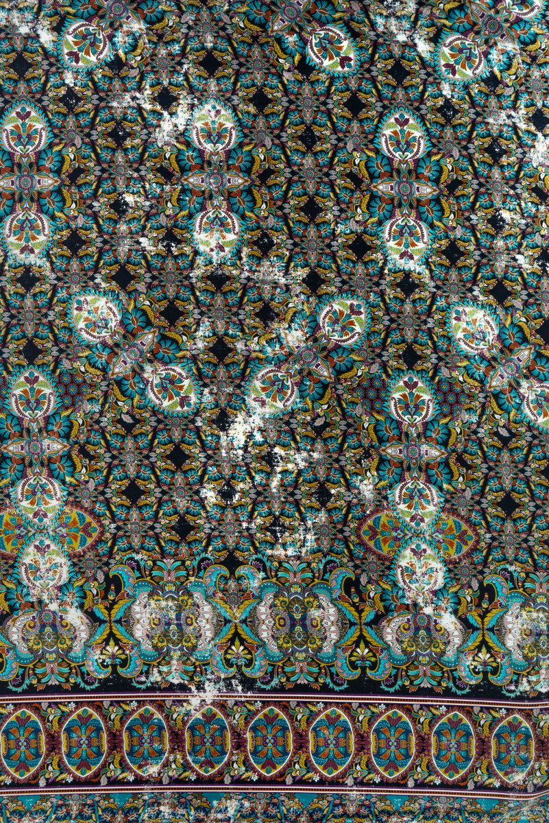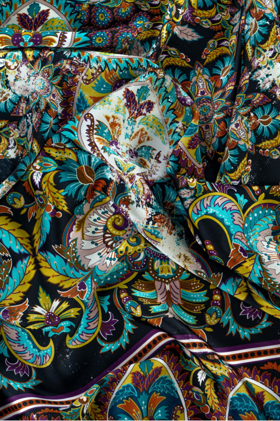 Italiensk polyestersatin i sort med et tæt, farverigt orientalsk motiv. Udskriften har en "gnidningseffekt", som er synlig på billederne. Stoffet langs den ene kant er færdig med en dekorativ kant 18 cm bred - vi syr den omkreds.