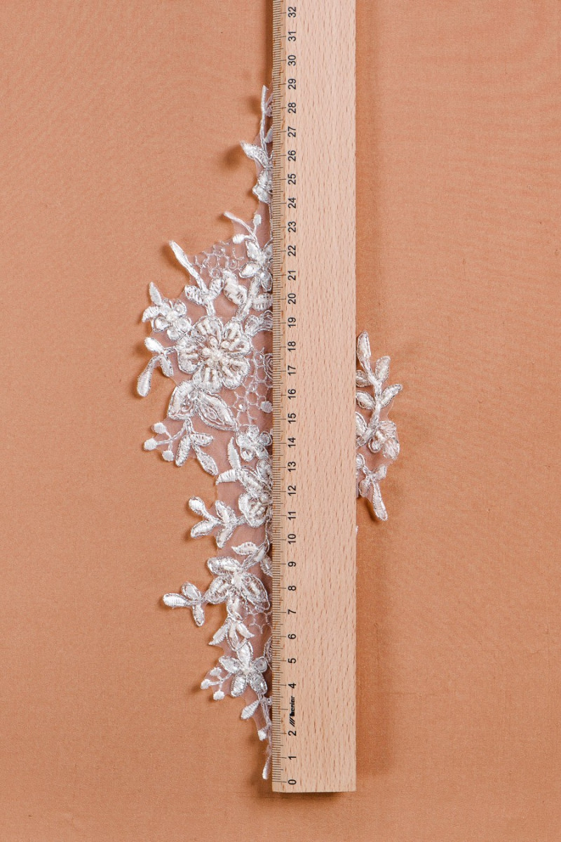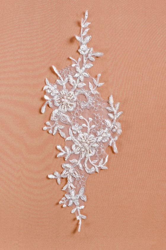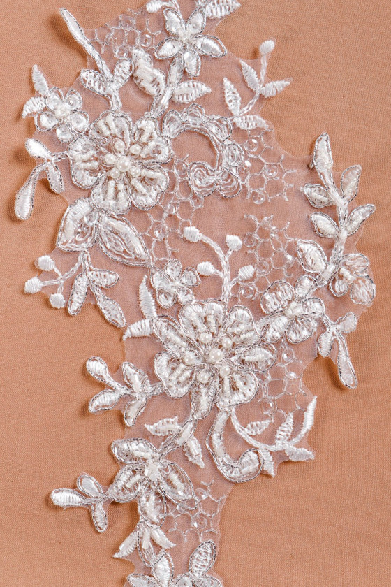 Italiensk, bryllup haberdashery applikation i cremefarve. Blomstermotiv dekoreret med perler, perler og gennemsigtige pailletter og sølv lurex tråd. Det hele er syet på orgelet.