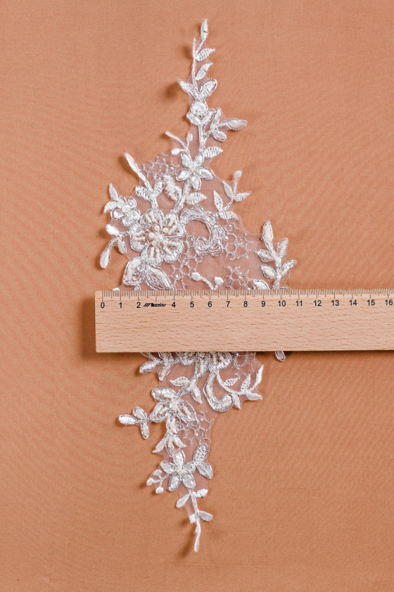 Italiensk, bryllup haberdashery applikation i cremefarve. Blomstermotiv dekoreret med perler, perler og gennemsigtige pailletter og sølv lurex tråd. Det hele er syet på orgelet. Mål: 28cm*12cm.