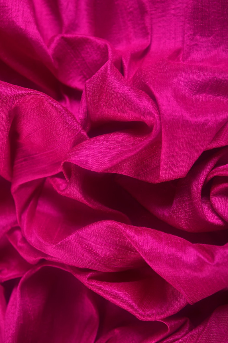 Shantung silke med en klassisk, original vævning med "barbs" i en intens pink-pink farve, er et løst vævet stof, farvet naturligt. Kun renseri!