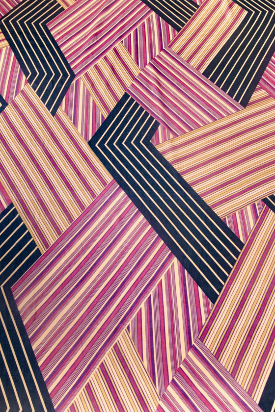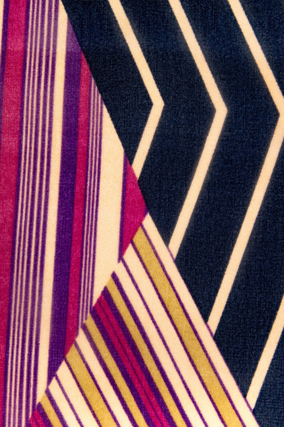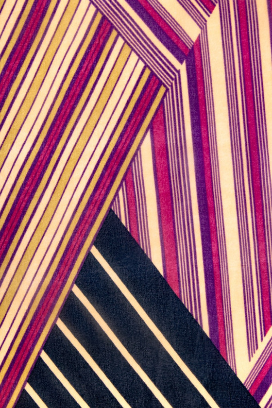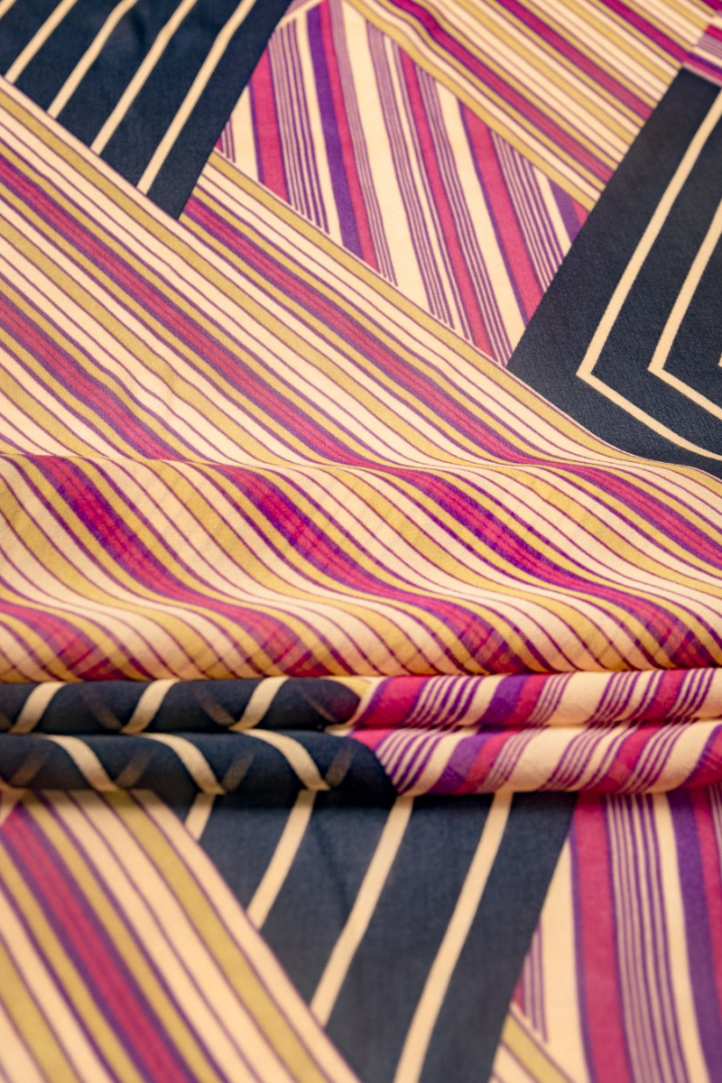 Silke georgette i uregelmæssige moduler med farvede striber (rød, sort og gul) Det er et let elastisk, mat, meget delikat, halvgennemsigtigt stof (kræver for