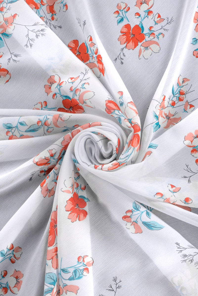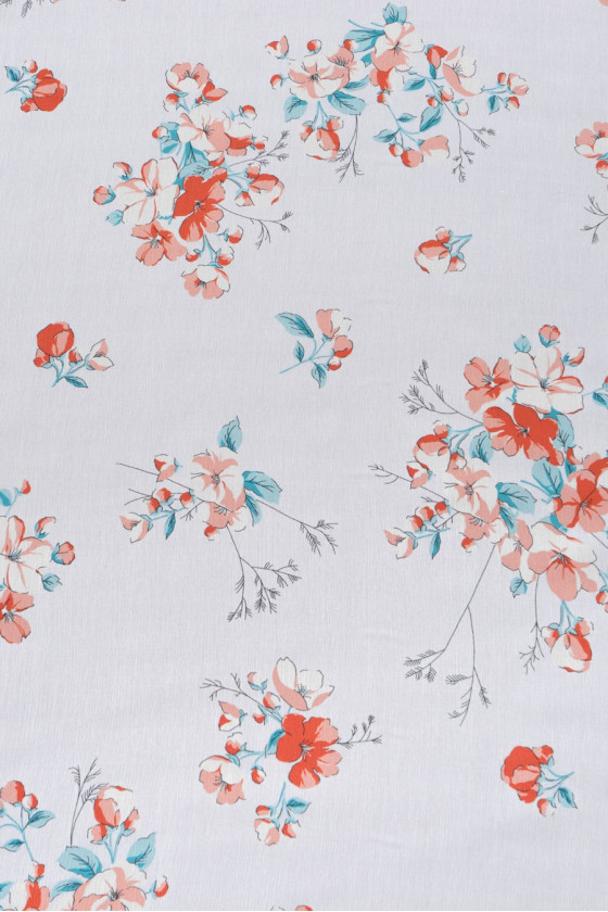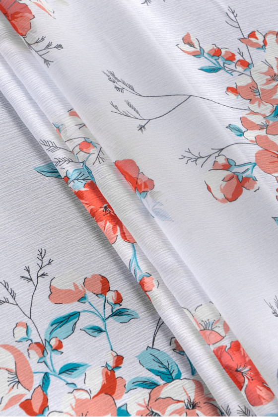 100% silkechiffon fra et velkendt modemærke vævet ind i et let kryb. Farver: på en meget lyseblå baggrund, et tryk af sarte blomster i orange koral og turkis. Stoffet er tyndt og uelastisk, let gennemsigtigt, meget luftigt. Vi anbefaler den til sommerkjoler, bluser, tunikaer eller lange nederdele.