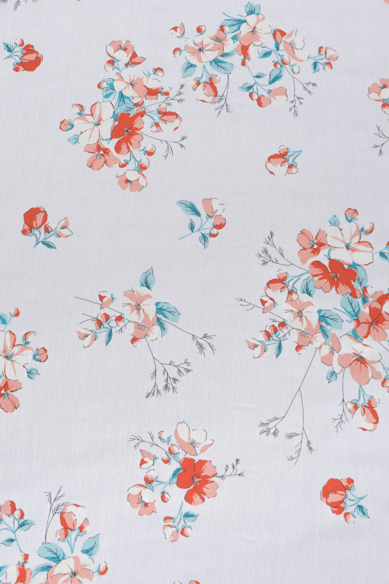100% silkechiffon fra et velkendt modemærke vævet ind i et let kryb. Farver: på en meget lyseblå baggrund, et tryk af sarte blomster i orange koral og turkis.