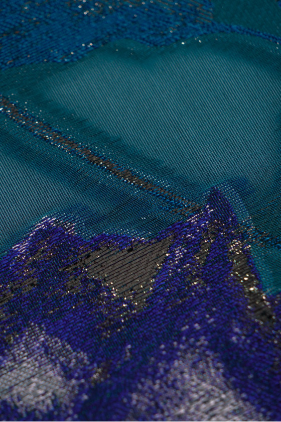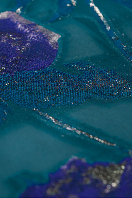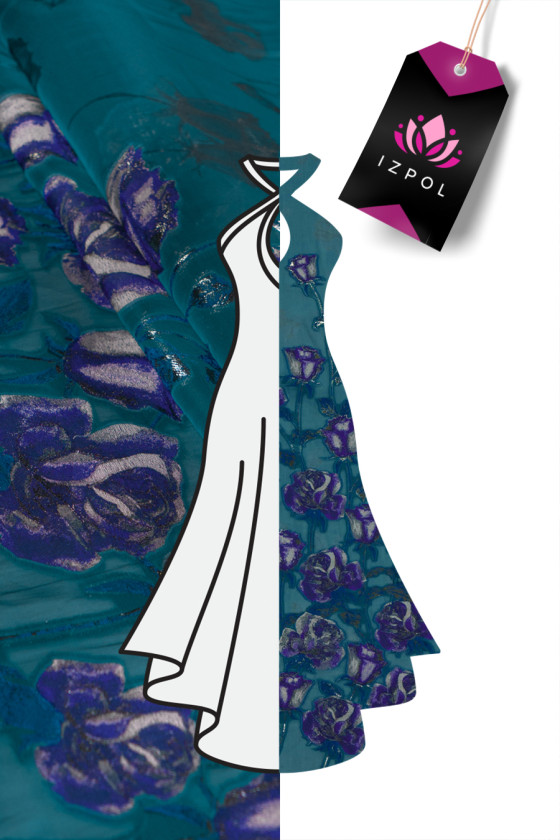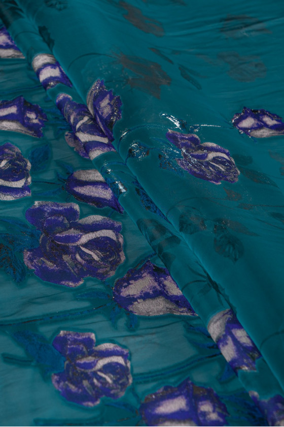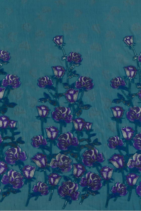 Italiensk silkeorganza i havgrøn med broderede sølv-kornblomstblomster og malede blomster i sort. Mønsteret består af tre symmetriske blomstermotiver med en højde på 115 cm, som mister tæthed mod midten af stoffet. Den er smukt dekoreret med skinnende tråd, som tilføjer elegance til den. Stoffet kommer i en kupon med mål på 150 cm*145 cm.