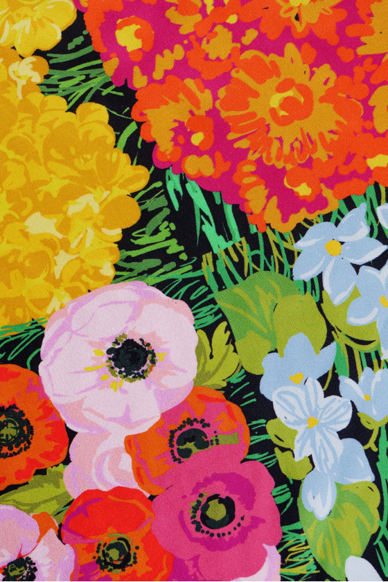 Italiensk 100% silke twill stof med blomstermotiver på sort baggrund, motiverne er arrangeret i form af firkanter 20 cm brede. Silke twill er et stof med en twill vævning, blød, meget holdbar, forsigtigt stiv at passe. Perfekt til syning af skjorte, kjole, nederdel eller sjal/tørklæde.