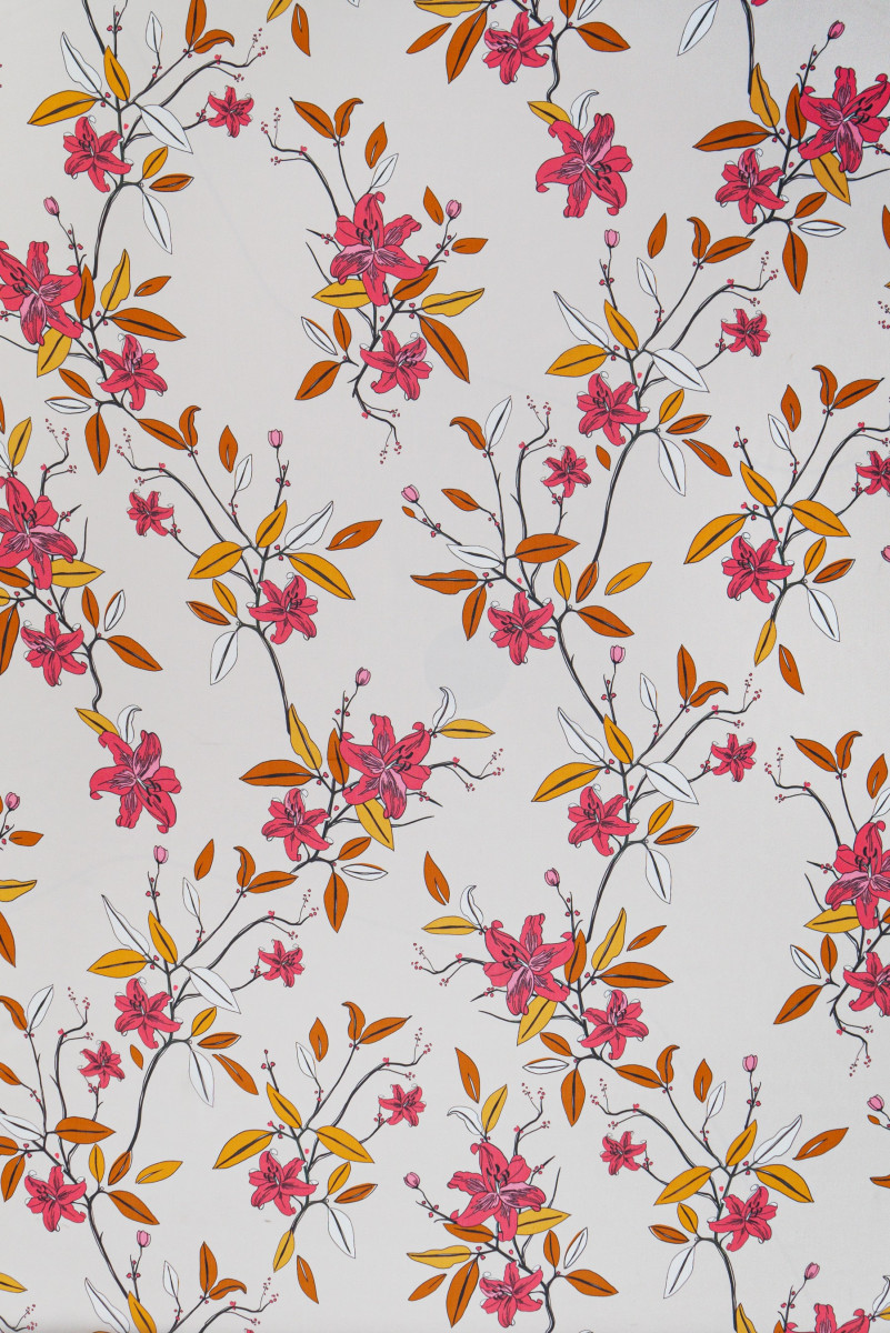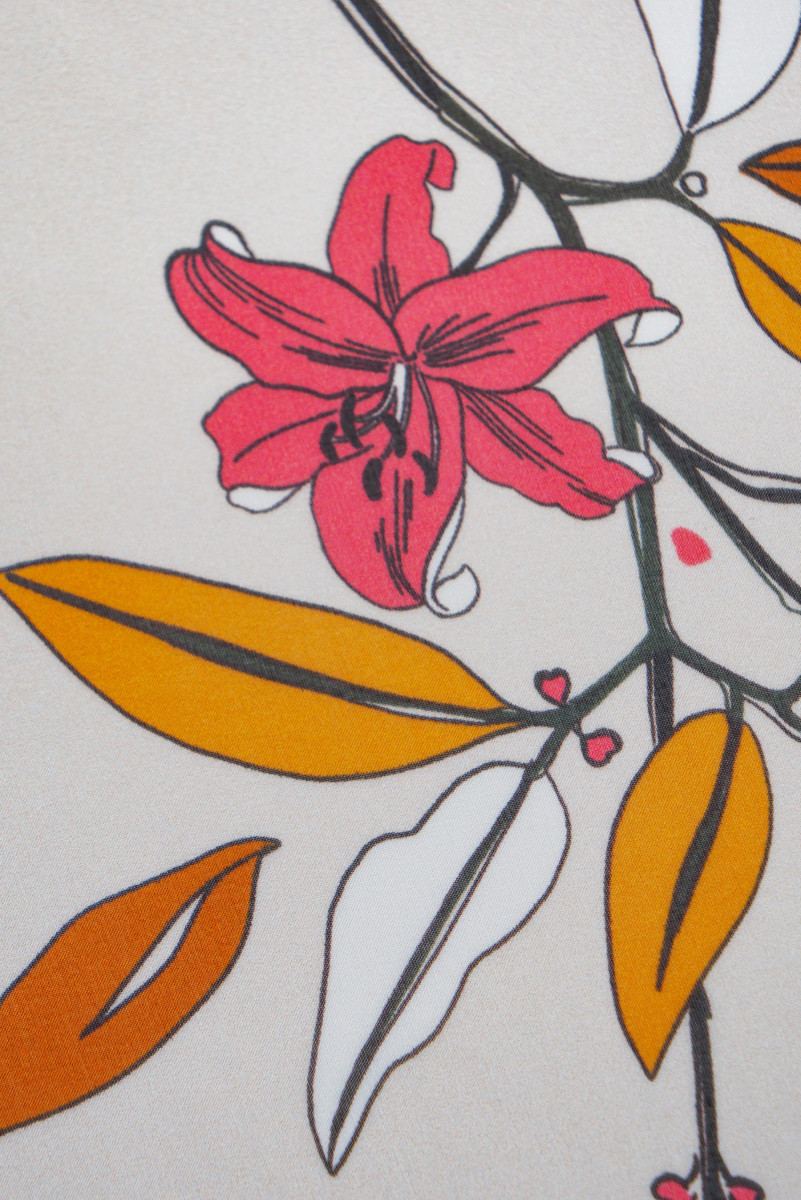 Italiensk muslin 100% silke i lys beige med blomstermotiv i hindbær og lys orange. Muslin lavet af naturlig silke er et meget delikat, luftigt og gennemsigtigt stof. Perfekt til luftige kjoler og bluser. Ikke-elastisk stof.