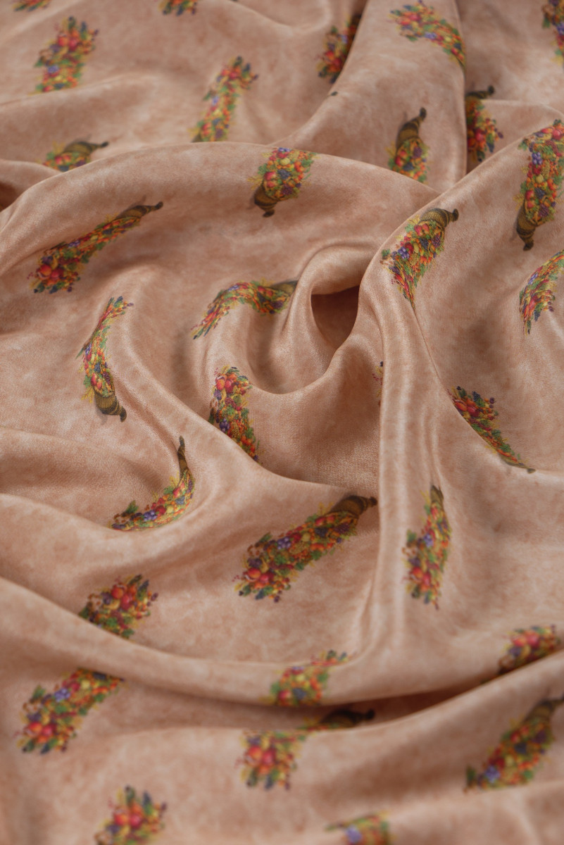Italiensk 100% silkecrepe med motivet "Cornucopia" (6 cm) på beige baggrund. Silkecrepe er et delikat, tyndt, halvmat stof. Det kan bruges til at fremtrylle luftige kjoler, sarte bluser, tørklæder, tørklæder.
