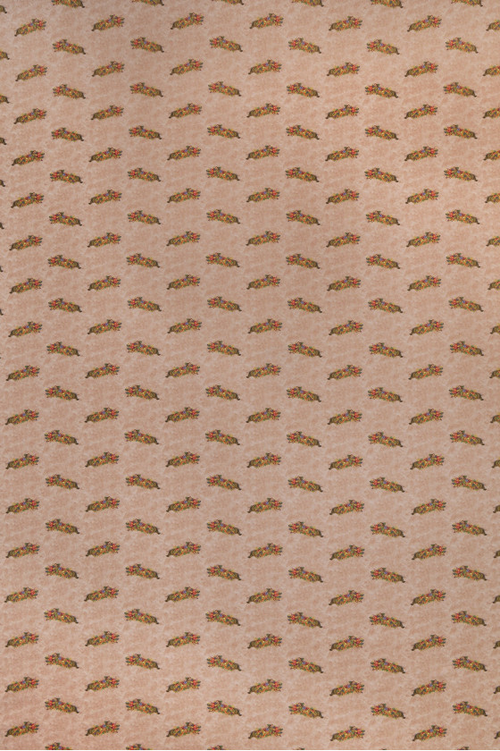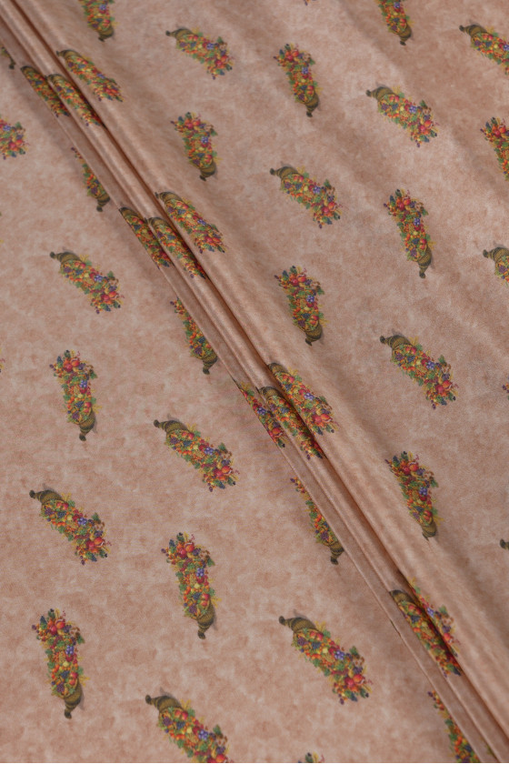 Italiensk crepe 100% silke med et "Cornucopia" motiv (6 cm) på en beige baggrund. Silkecrepe er et delikat, tyndt, halvmat stof.