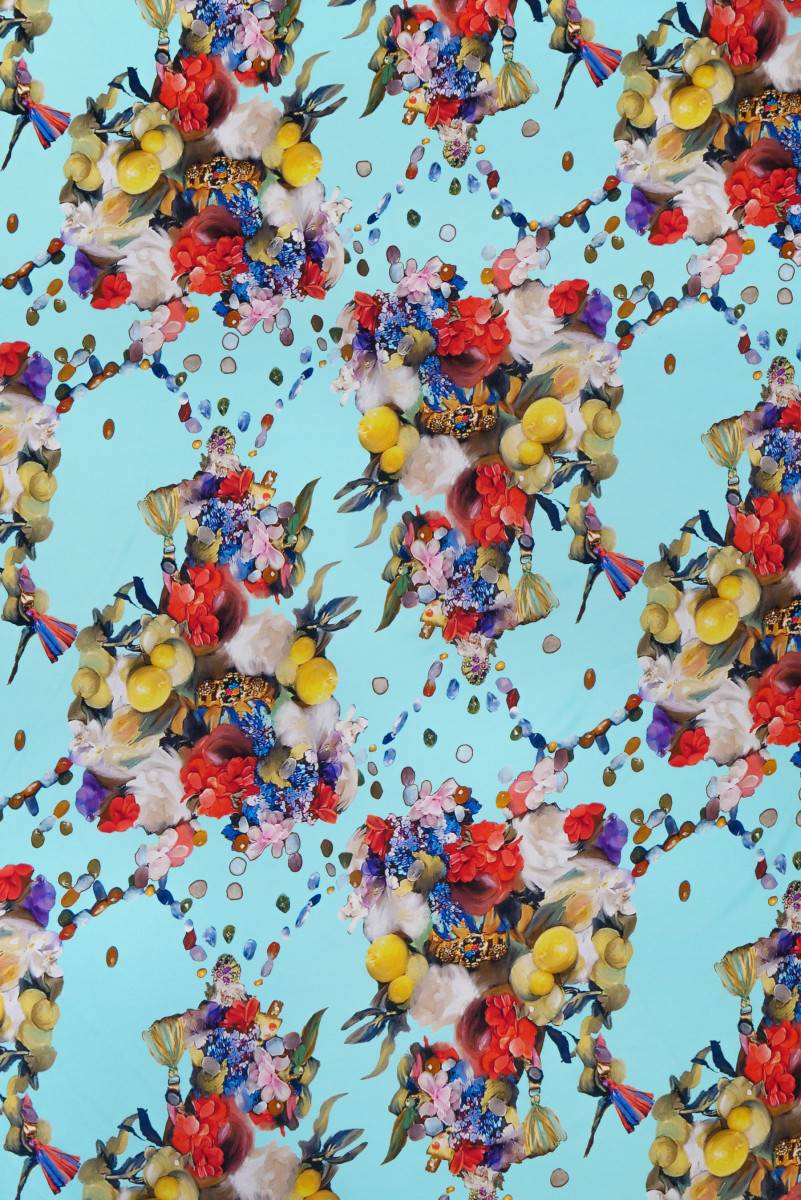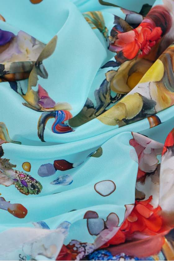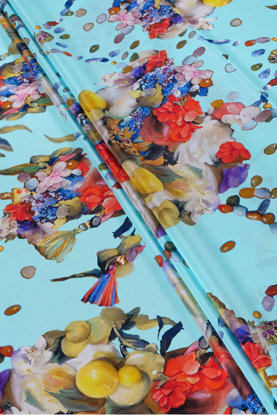 Italiensk 100% silkecrepe i lys turkis med motiv af farverige frugt- og blomsterkompositioner omgivet af små småsten. Silkecrepe er et delikat, tyndt, halvmat stof. Det kan bruges til at fremtrylle luftige kjoler, sarte bluser, tørklæder, tørklæder.
