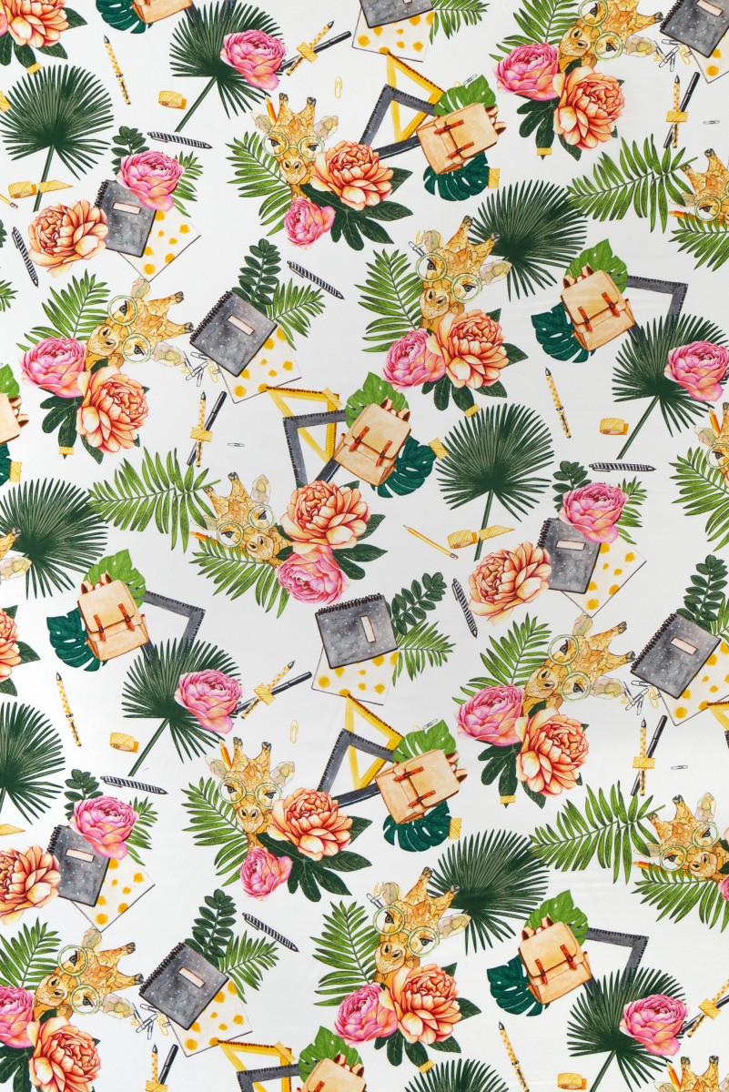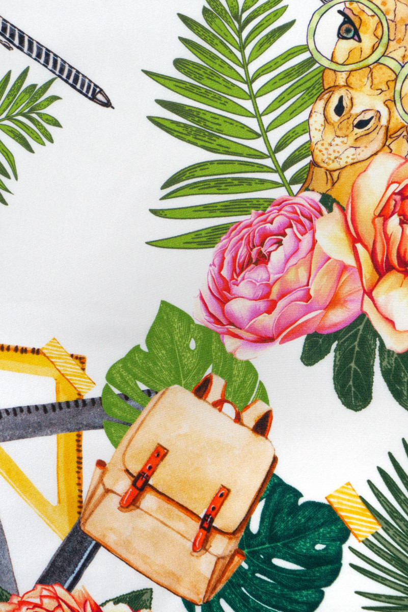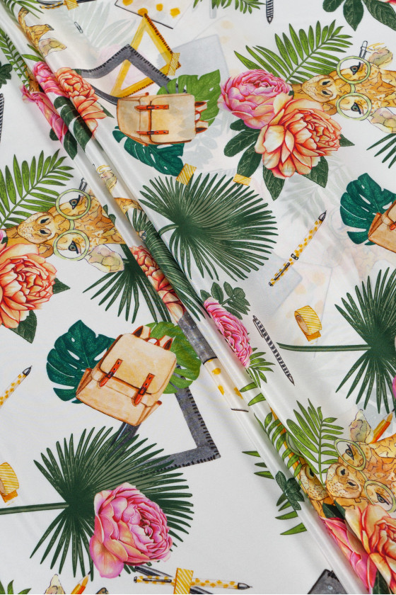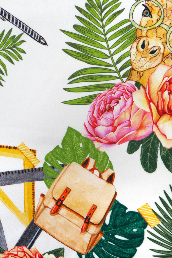 Italiensk 100% silke habotai stof i écru farve med et motiv af giraf, blomster, blade og notesbøger. Tyndt, meget delikat, gennemsigtigt stof (kræver brug af foring), mat.