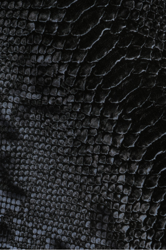 Italiensk satin 100% silke med et slangeskindsmotiv i grå og sort. Silke satin er et delikat stof, fløjlsagtigt at røre ved, med en let glans.
