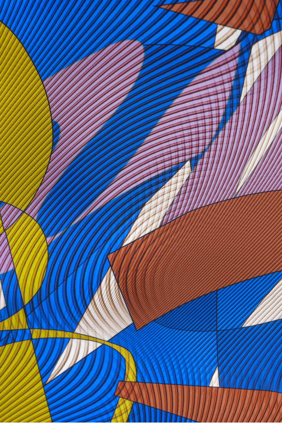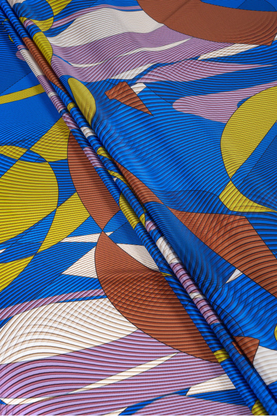 Italiensk silkecrepe med en blanding af elastan med store geometriske mønstre i kornblomst, sennep og brun. Silkecrepe er et delikat, tyndt, halvmat stof.