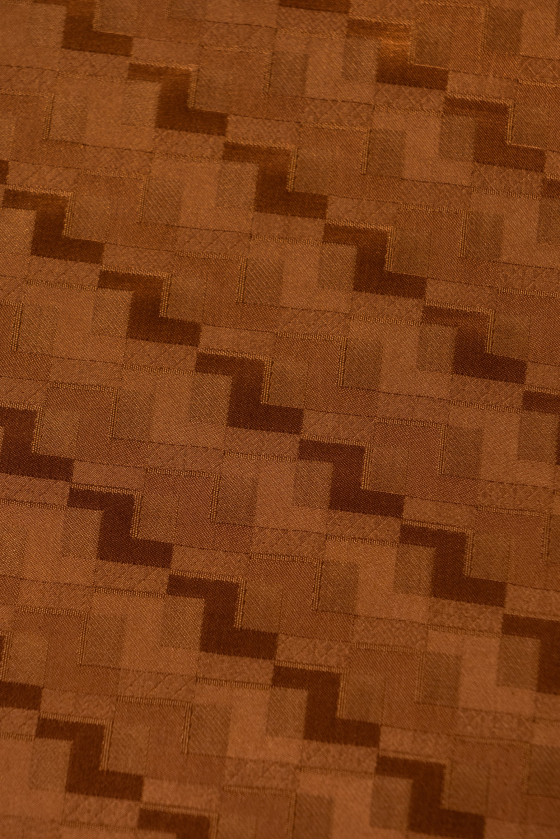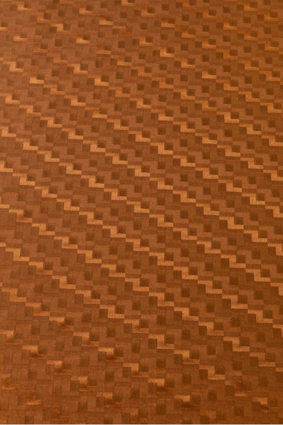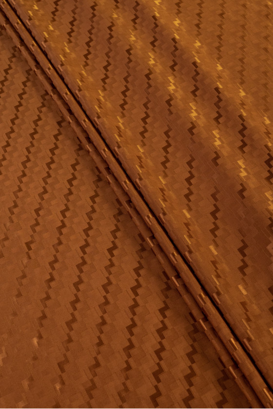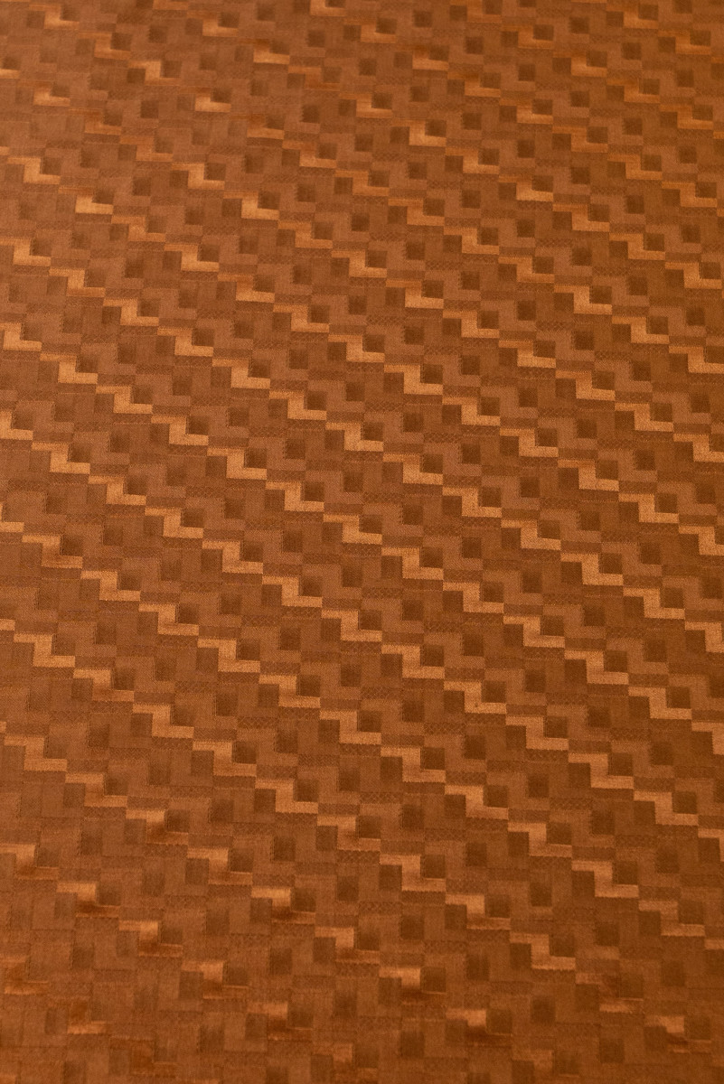 Italiensk 100% silkestof i rødt, jacquardvævet stof med zigzagmotiv arrangeret diagonalt. Et ikke-elastisk stof, tyndt, men uigennemsigtigt, let med en glans, der er karakteristisk for silkestoffer.