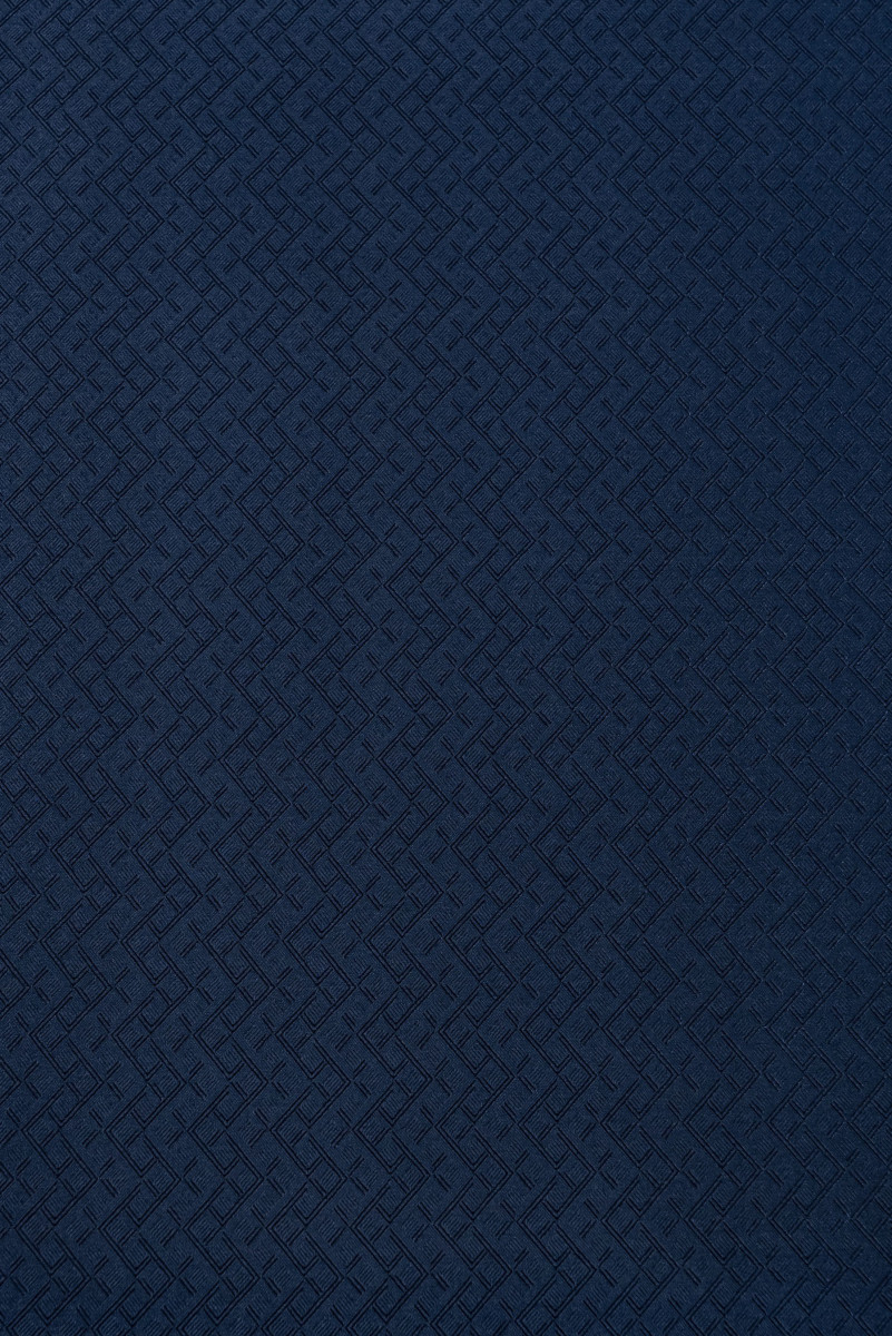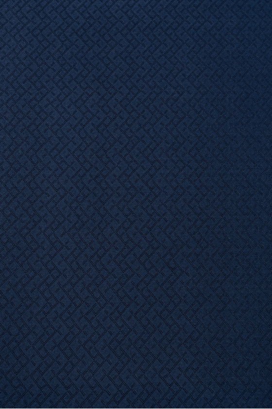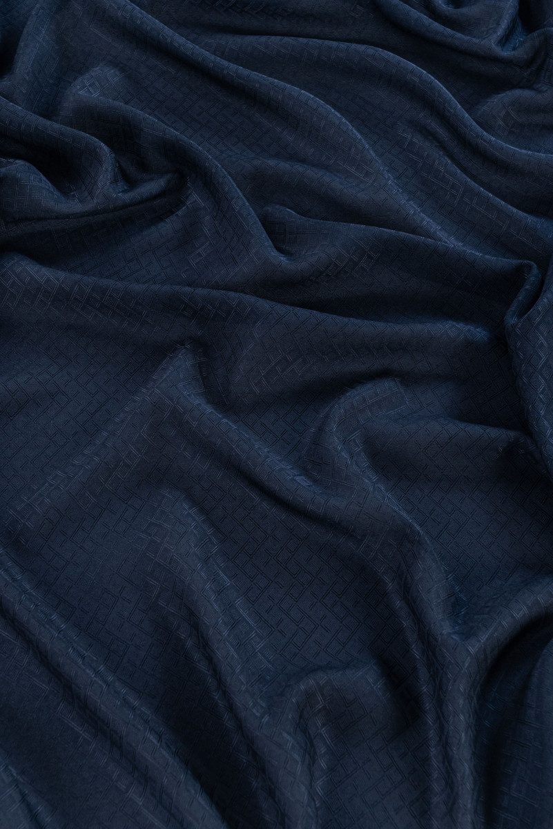 Italiensk 100% silkestof i marineblåt, jacquardvævet stof med geometrisk motiv - diamanter. Et ikke-elastisk, tyndt, let gennemsigtigt, let stof med en glans, der er karakteristisk for silkestoffer.