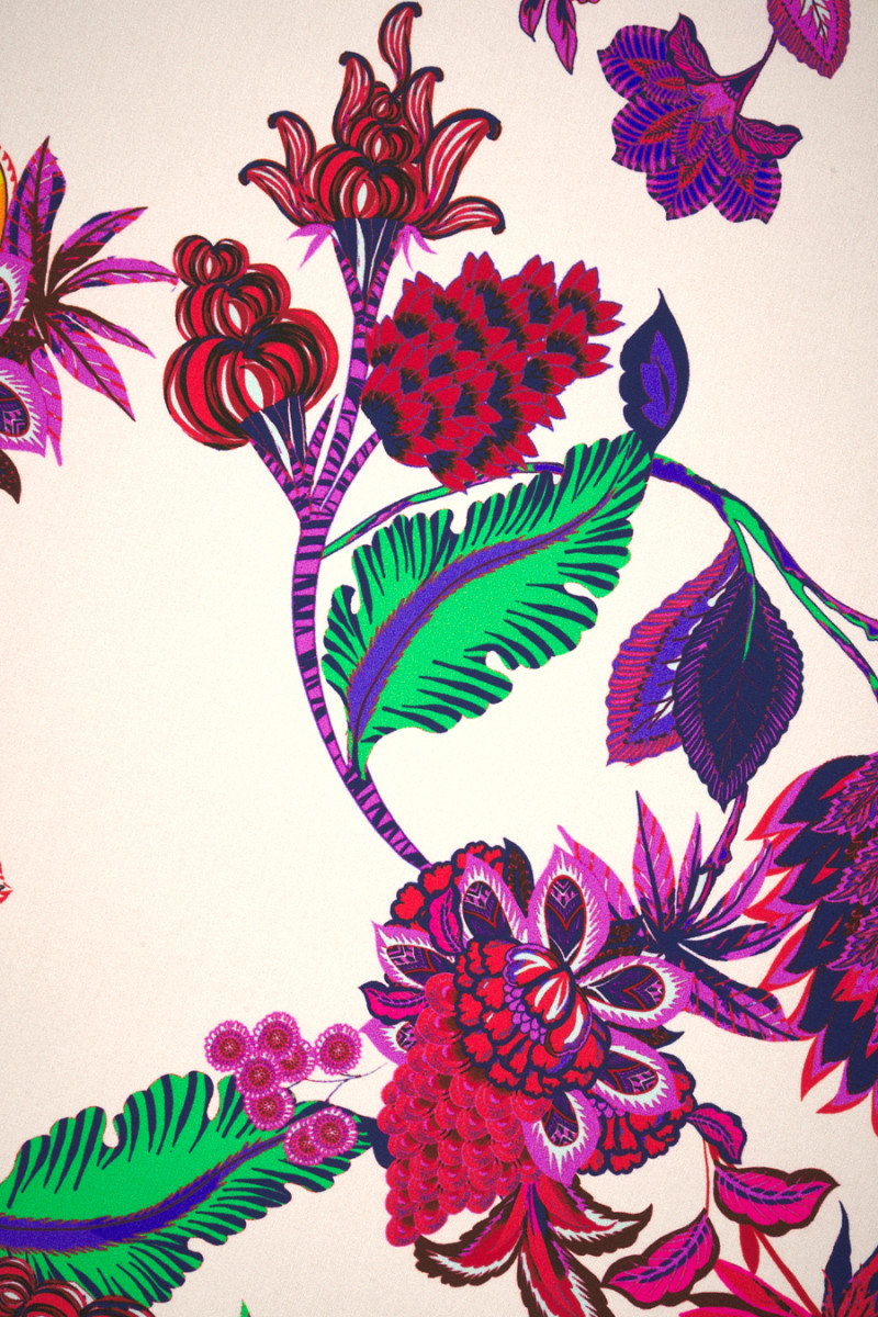 Italiensk silkesatin, elastik i ecru-farve med et motiv af farverige blomster - trykket er lavet på en mat side. Silke satin er et tæt og let stof med en flad overflade, lavet i en satinvævning. En yderligere fordel er dens glathed og holdbarhed, samt det faktum, at det passer meget godt, ikke viser sig igennem og er behageligt at røre ved. På den ene side er den mat, og på den anden side er den ædelt skinnende. Det kan bruges til at fremtrylle luftige kjoler, sarte bluser, nederdele, tørklæder, tørklæder.
