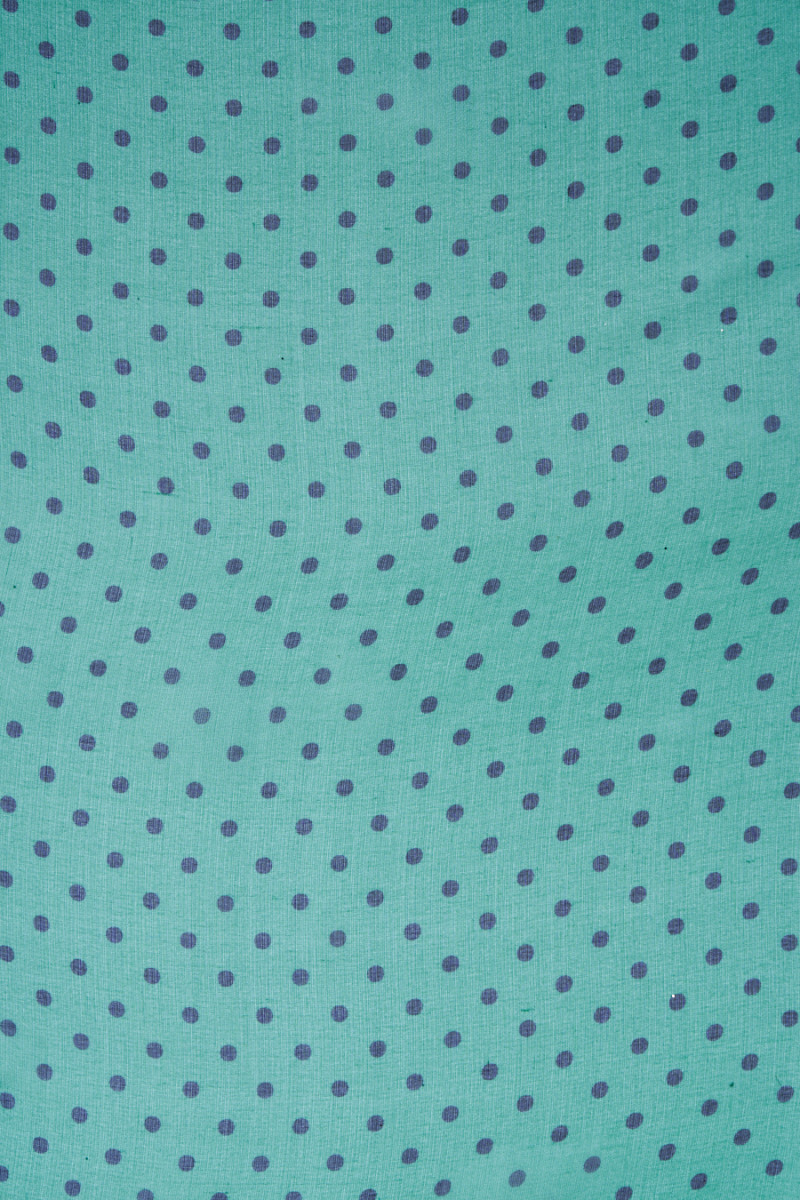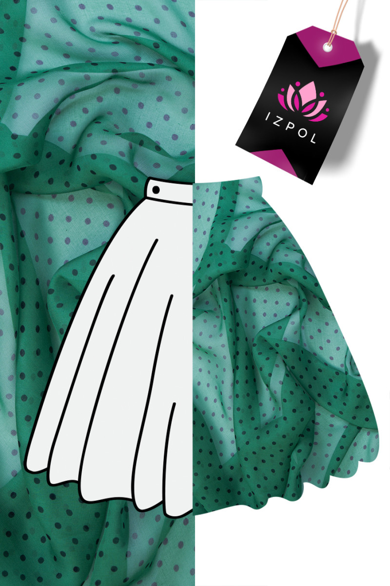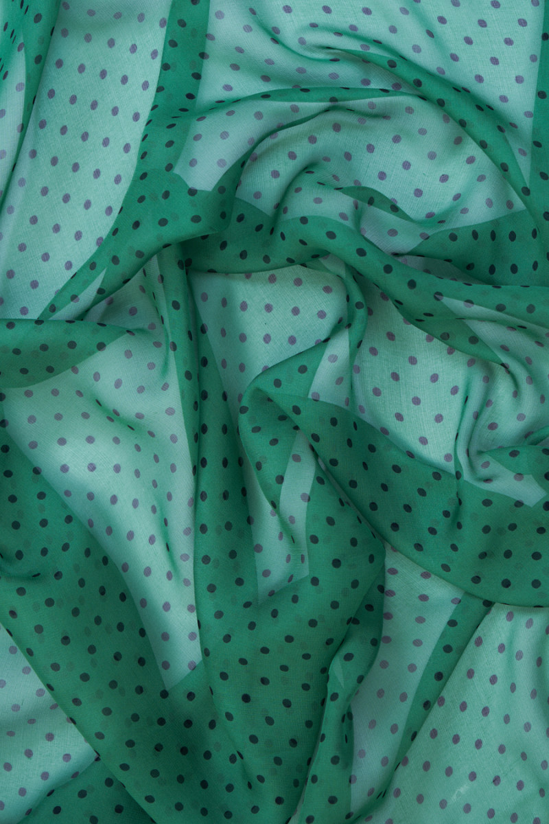 Italiensk muslin 100% silke i grøn farve med tæt arrangerede sorte prikker med en diameter på 0,3 cm. Et smukt forslag til folk, der kan lide tidløse mønstre i subtile, mørke farver.