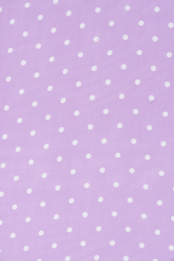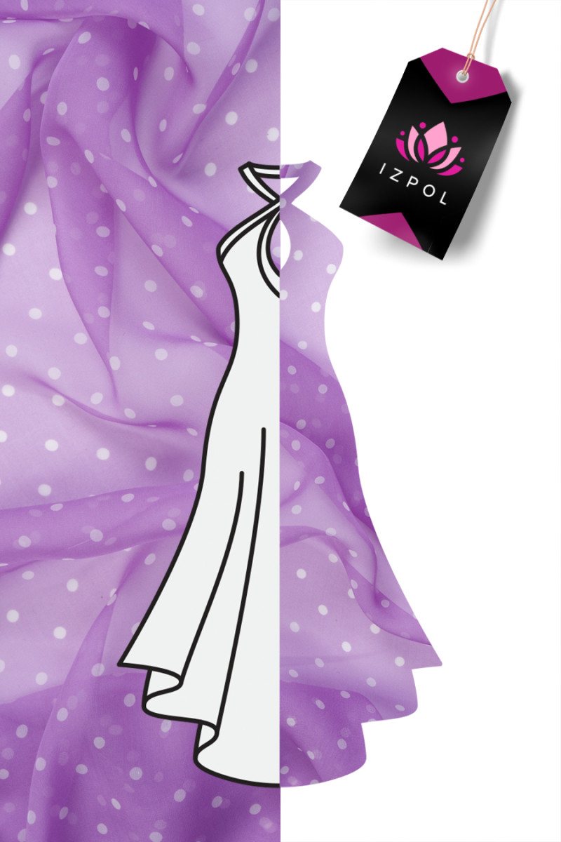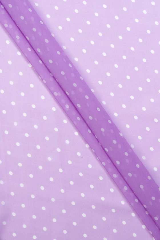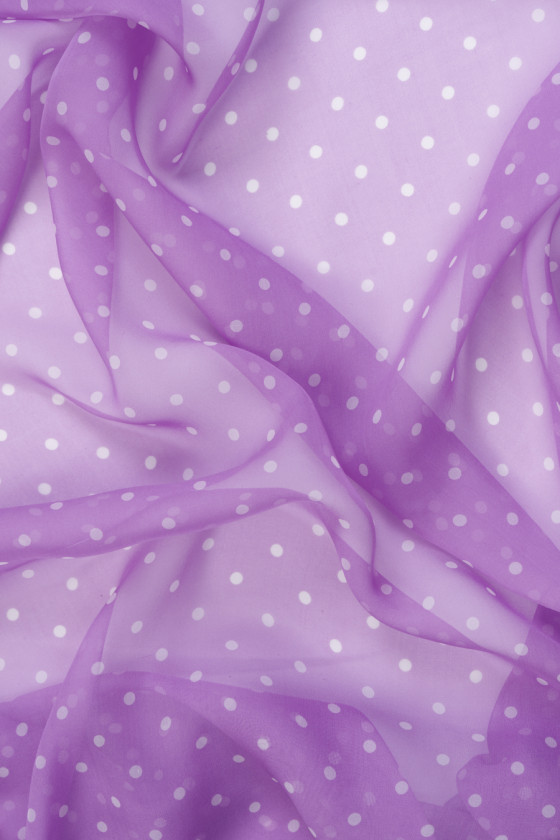 Italiensk muslin 100% silke i lyngfarve med creme prikker med en diameter på 0,5 cm. Et smukt forslag til folk, der kan lide tidløse mønstre i subtile, mest fashionable farver.