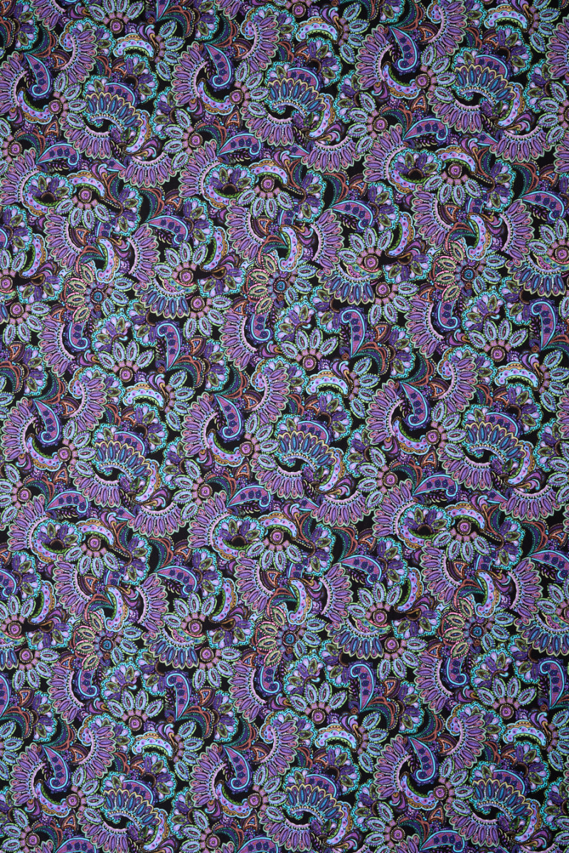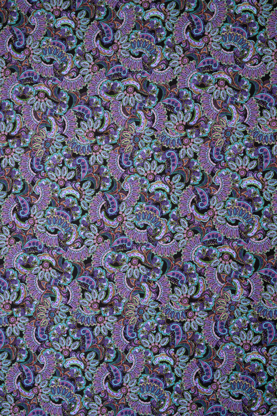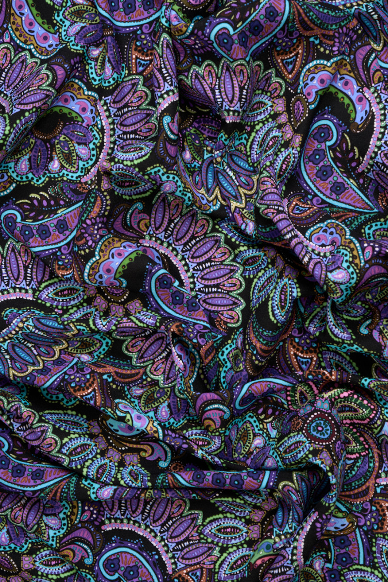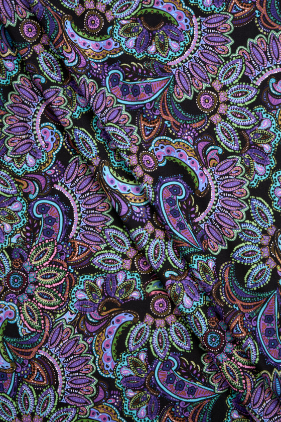 Italiensk silkesatin med tilsætning af elastan med et tæt paisleymønster i nuancer af lilla, grøn, blå på sort baggrund. Stoffet er blødt, elastisk og passer smukt til printet lavet på den matte side. Et fantastisk forslag til folk, der kan lide orientalske motiver i stærke farver. Dette stof er perfekt til syning af en kjole, nederdel eller smuk skjorte.