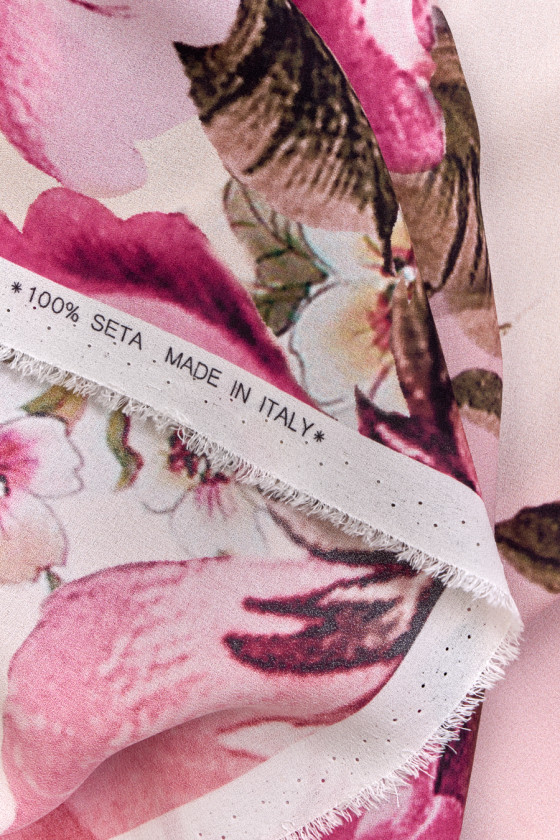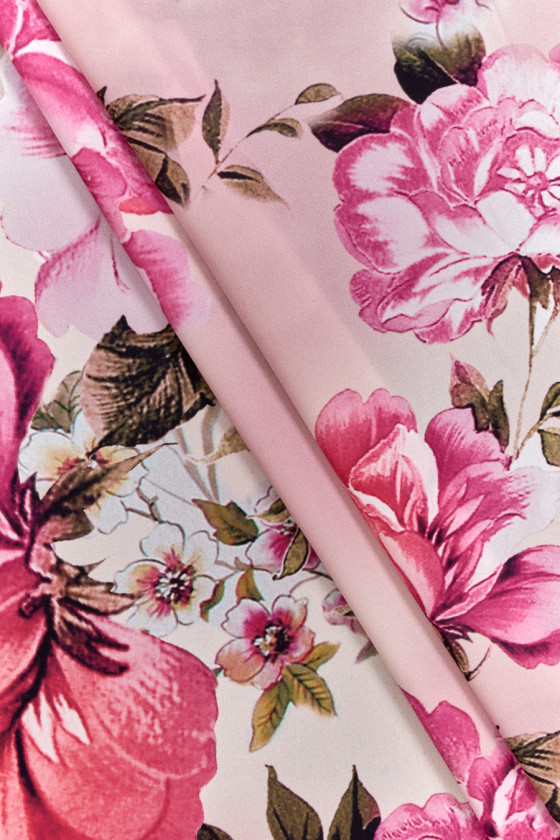 Italiensk georgette 100% silke med store lyserøde koralblomster på en skyggefuld pink og creme baggrund. Stoffet er meget let, luftigt, ikke-elastisk, mat og halvgennemsigtigt. Et smukt forslag i afdæmpede farver til dem, der kan lide elegante og tidløse farvekombinationer. Stof beregnet til kjoler eller nederdele.
