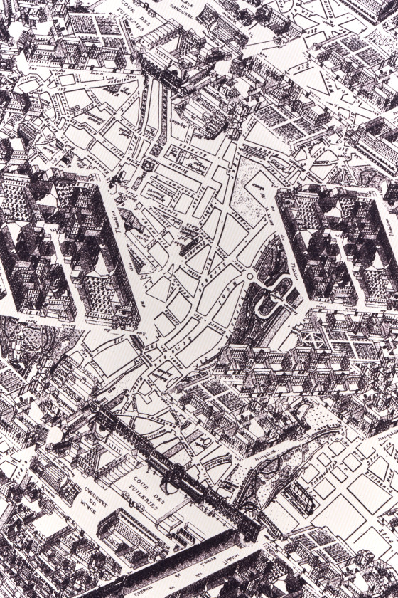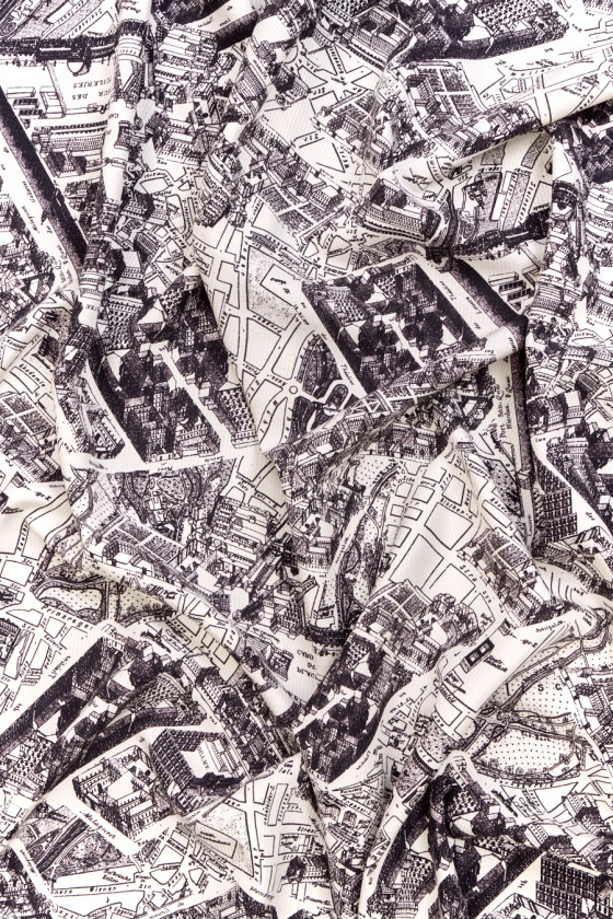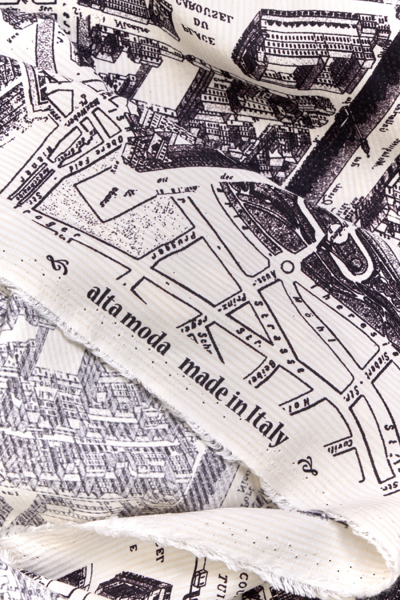 Italiensk silkestof med byplanmotiv i sort på hvid baggrund. Et tæt mønster, der skildrer bygninger, gader, pladser med deres navne. Stof med jacquardstruktur - smalle striber i det hele taget, uelastisk, mat, lidt stiv, ligner bomuld i berøring. Et interessant forslag, hvorfra du kan oprette bluser, skjorter, kjoler og nederdele.