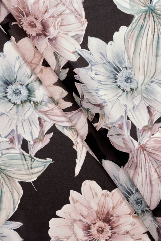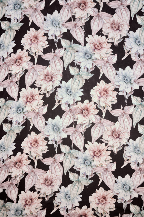 Italiensk chiffon 100% silke med store blomster i pastelfarver på sort baggrund. Tæt, gentagende mønster lavet i lyse nuancer af lyserøde, blå, grønne, blomster med en størrelse på 18cm*19cm. Stoffet er let, luftigt, let gennemsigtigt og kommer fra samlingen af en velkendt modedesigner. Et smukt forslag til at skabe en kjole, bluse eller nederdel i en romantisk udgave.