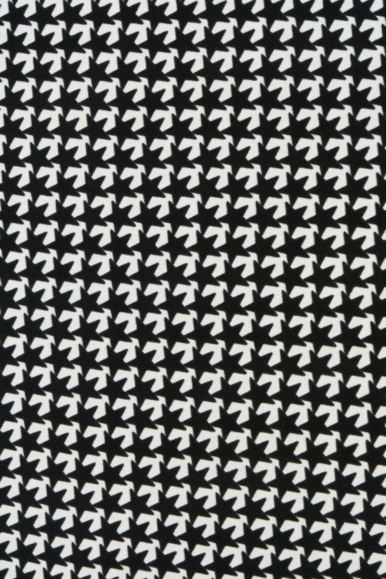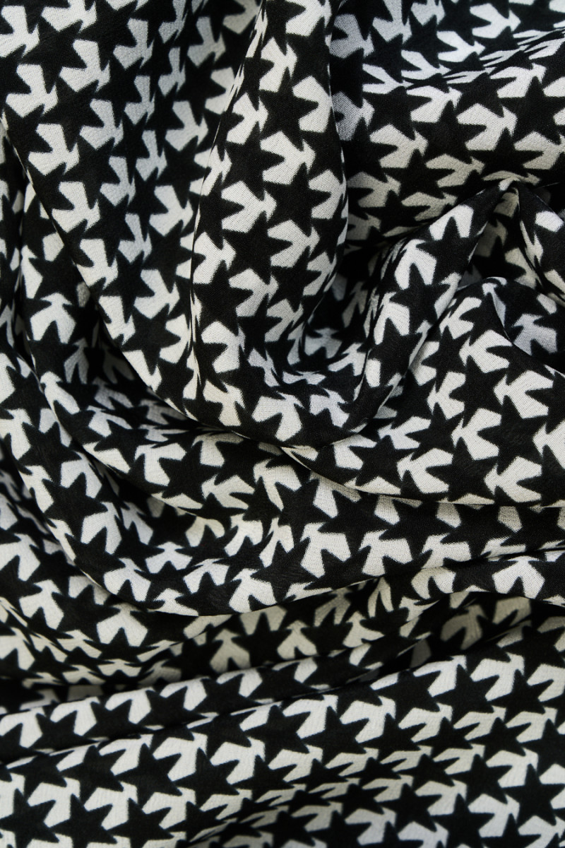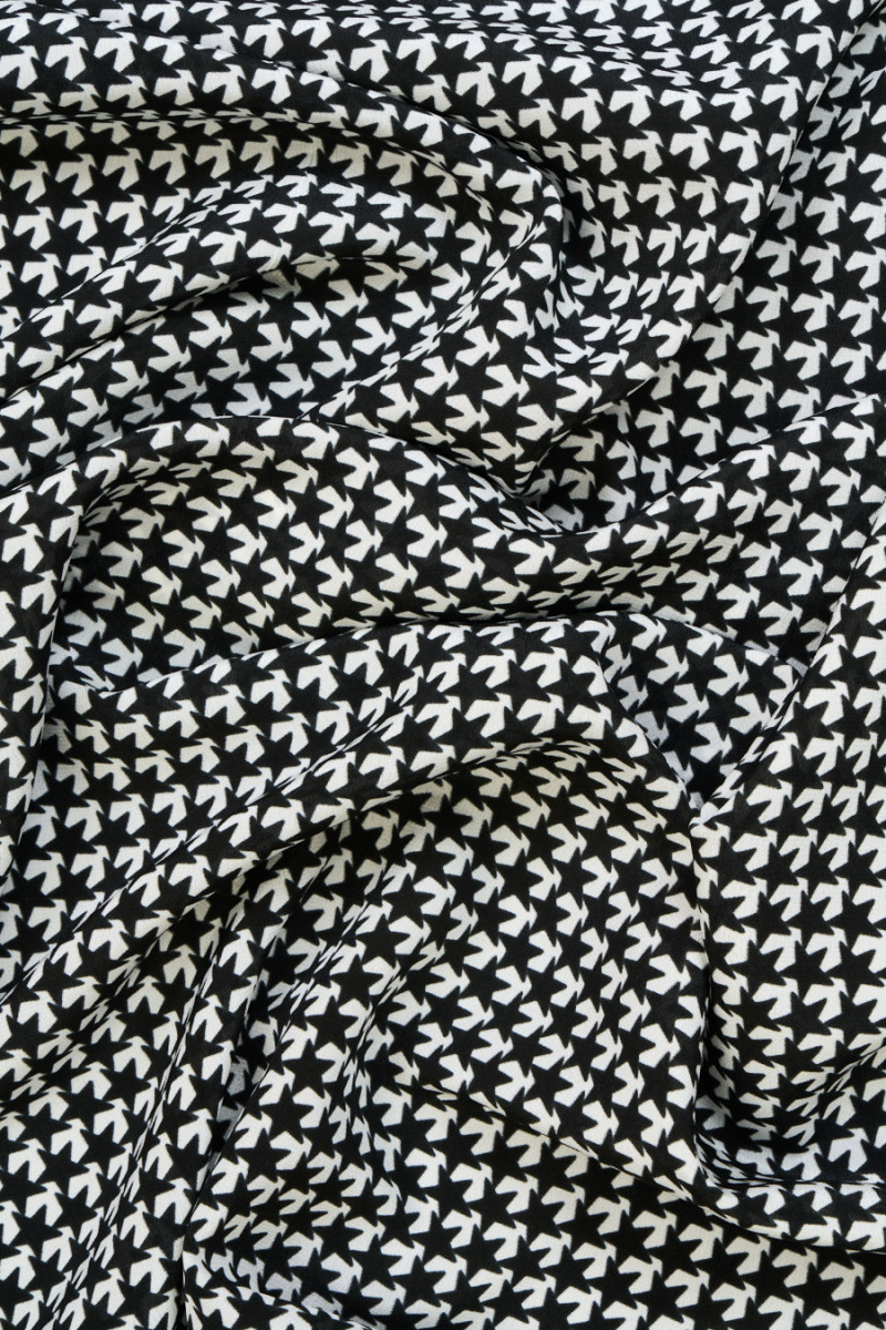 Italiensk 100% silke crepe med et motiv af små sorte stjerner på en hvid baggrund. Regelmæssigt og tæt design, hvor en stjerne er 1,4 cm*1,4 cm. Stoffet er let, tyndt, ikke-elastisk, mat og blødt draperet. Perfekt til bluser, skjorter og luftige kjoler og nederdele.