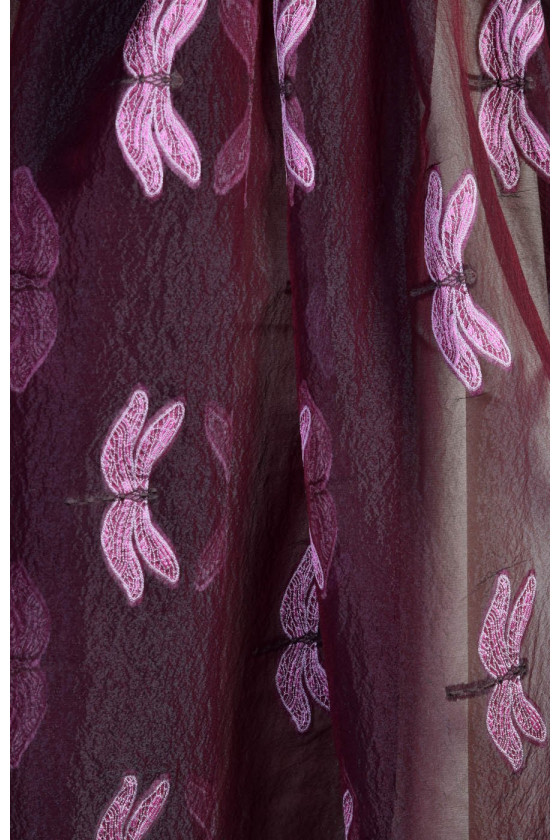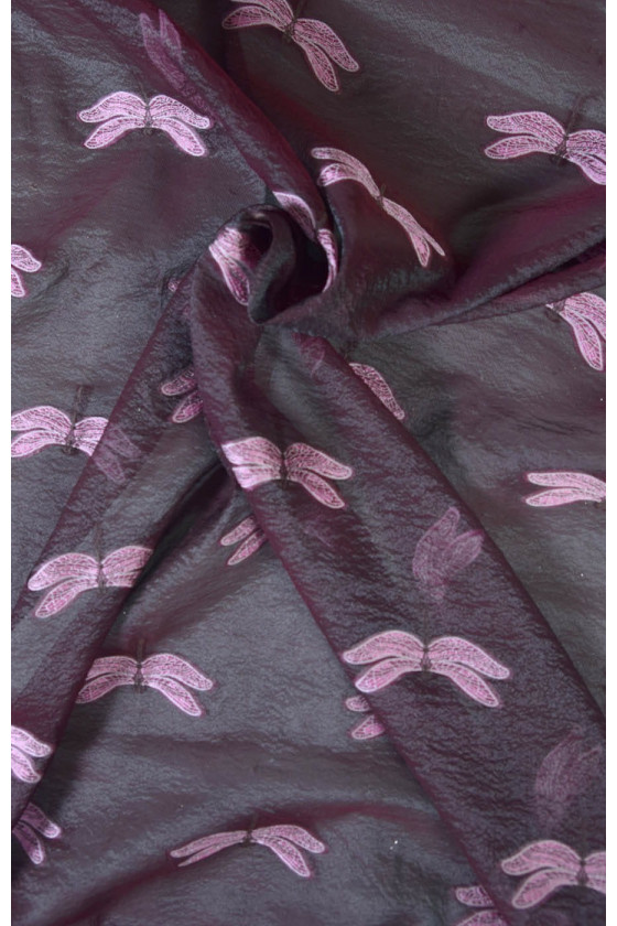 Smuk tyk organza lavet af naturlig silke, lidt gennemsigtig. Den har farverige, jacquard syet - guldsmede. Det hele passer perfekt. Stoffet er lidt stift, let. Perfekt til kjoler, nederdele.