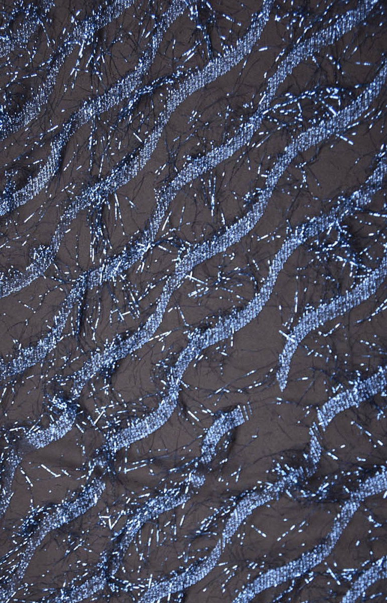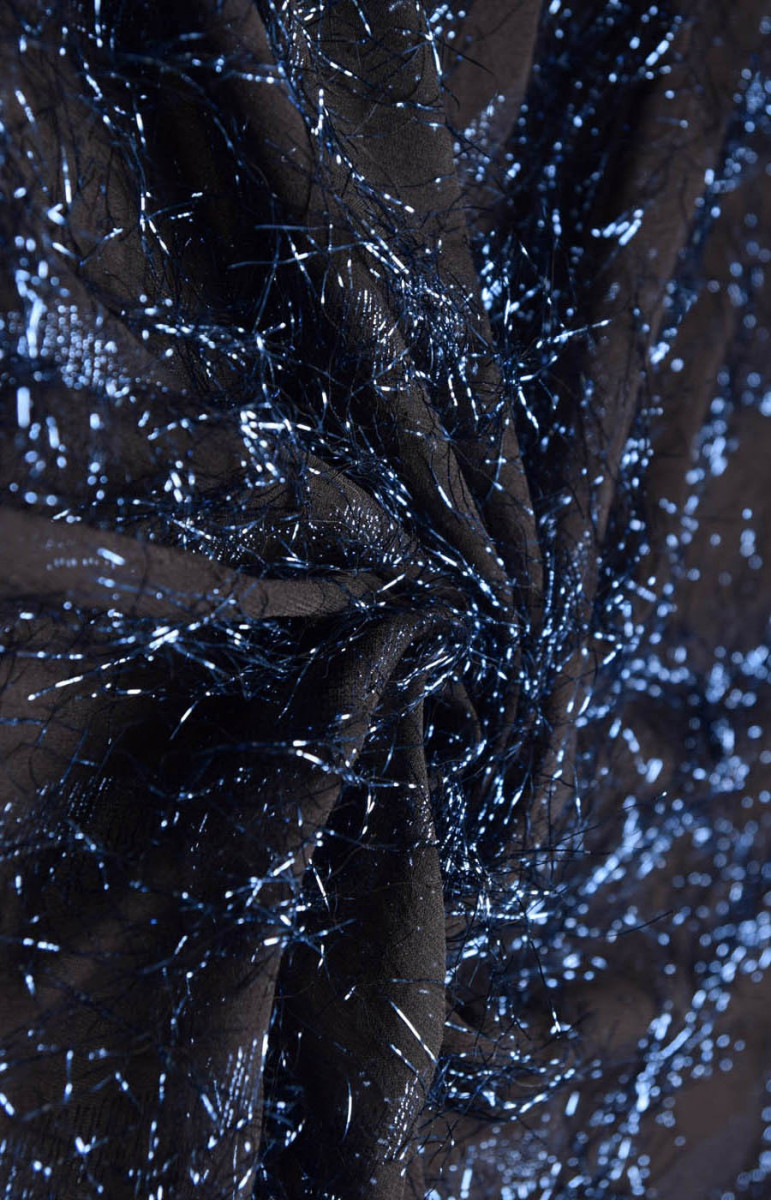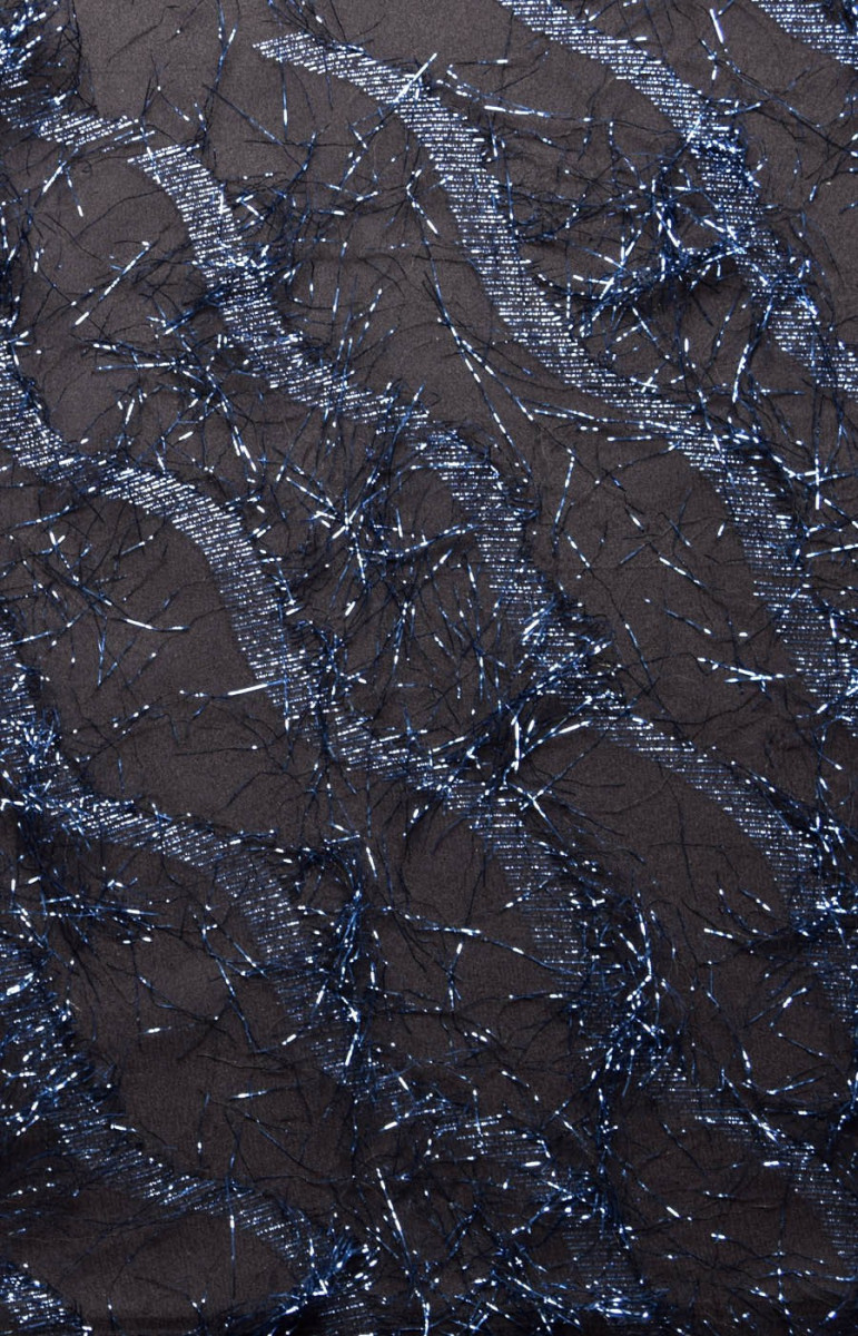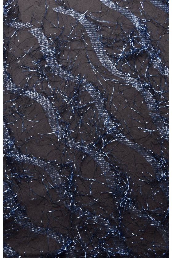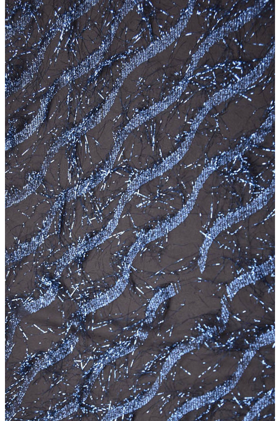 Et smukt, luftigt stof lavet af naturlig silke. Stoffet er ikke-elastisk, let gennemsigtigt. Pierced, interlaced med cornflower blå lurex tråde. Lurex danner et bølget mønster. Stoffet er perfekt til aftenkjoler eller bluser.