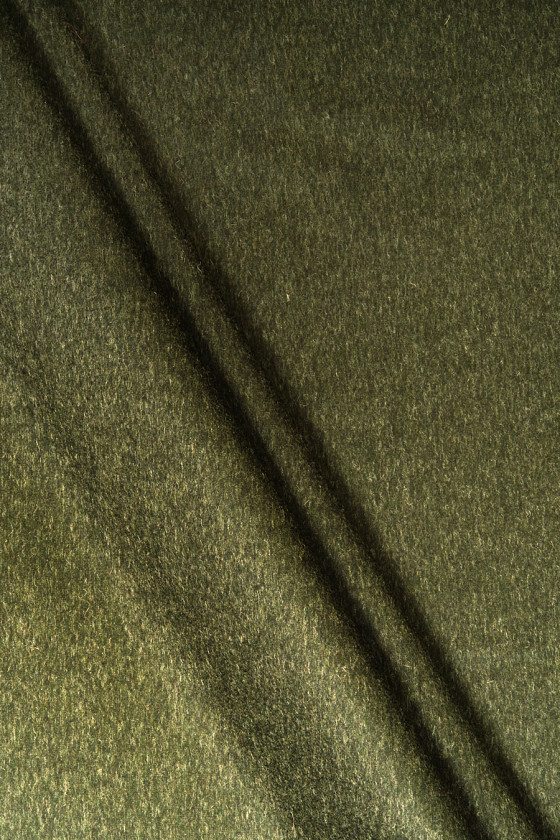 Italiensk vergin uld i mørkegrøn, som er brudt med lysere hår. Et meget blødt, ædelt stof med en delikat glans og kortere, presset bunke, perfekt til syning af en efterår-vinterfrakke, jakke eller varm vest. Den bedste kvalitetssammensætning får stoffet til ikke kun at se smukt ud, men er også meget varmt. Stoffet er perfekt til folk, der kan lide klassikere i højeste udgave.