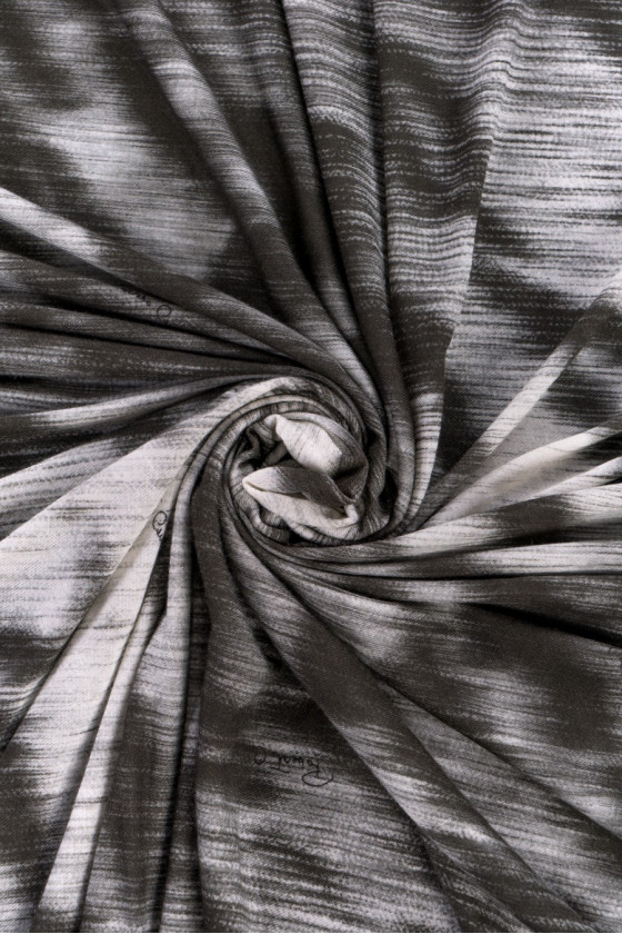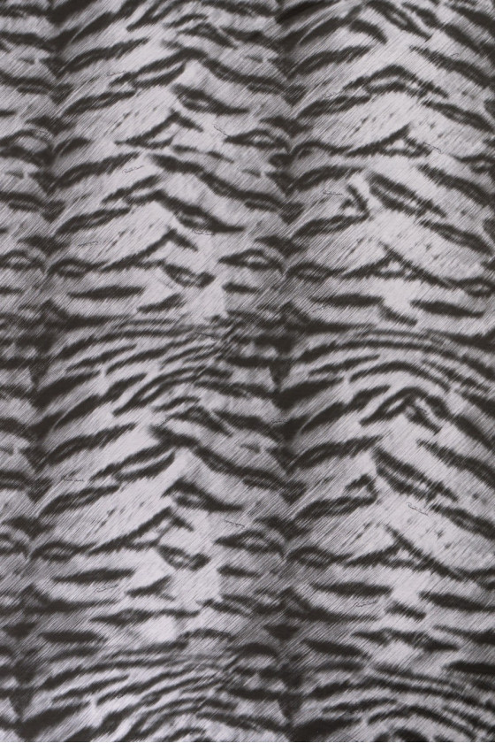 Italiensk viskose strikket stof, underskrevet med navnet på en berømt modedesigner. Elastisk stof, af meget god kvalitet. Dyremønster, der ligner en tiger. Farver: grå, oliven. Perfekt til syning af kjole, nederdel, bluse.
