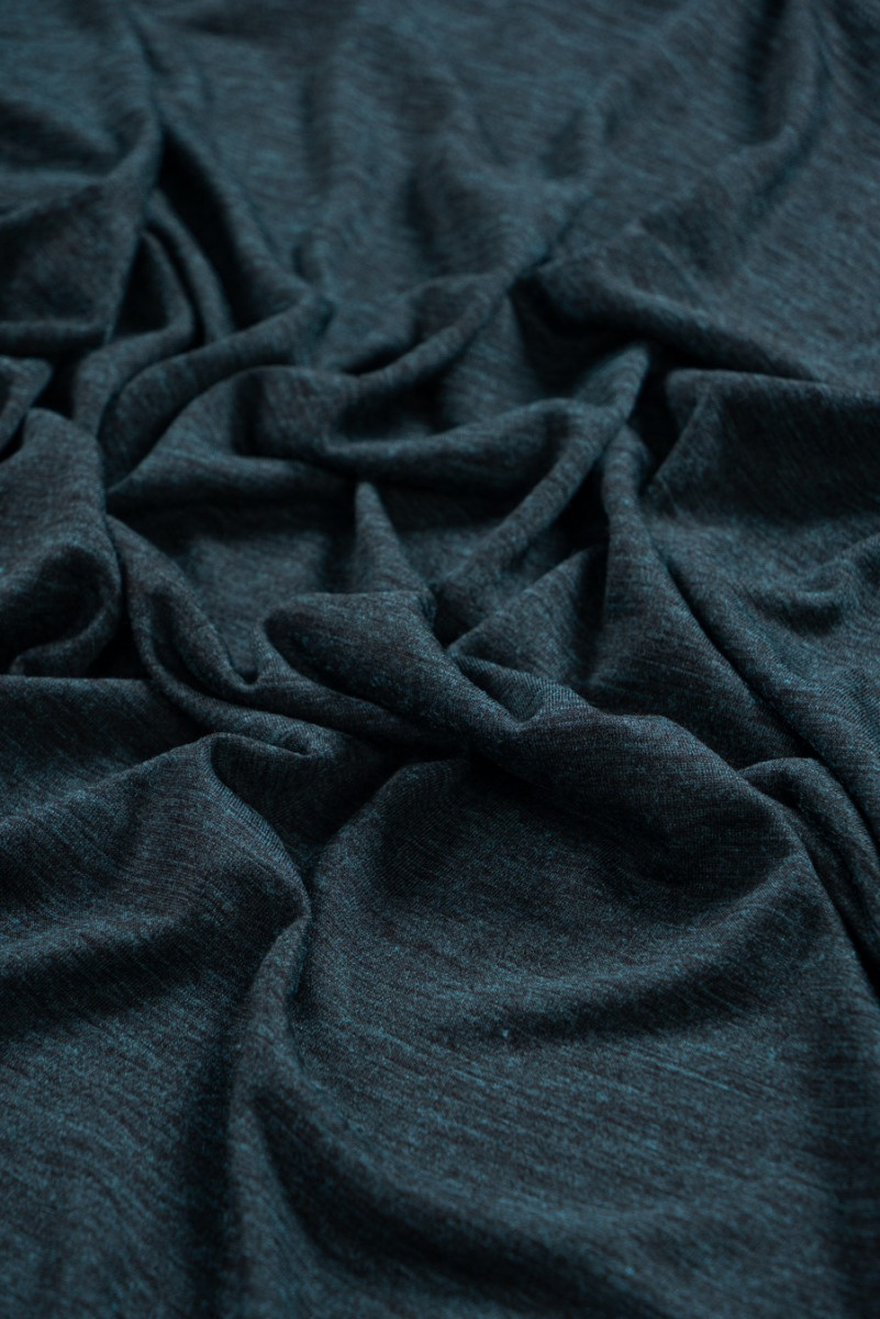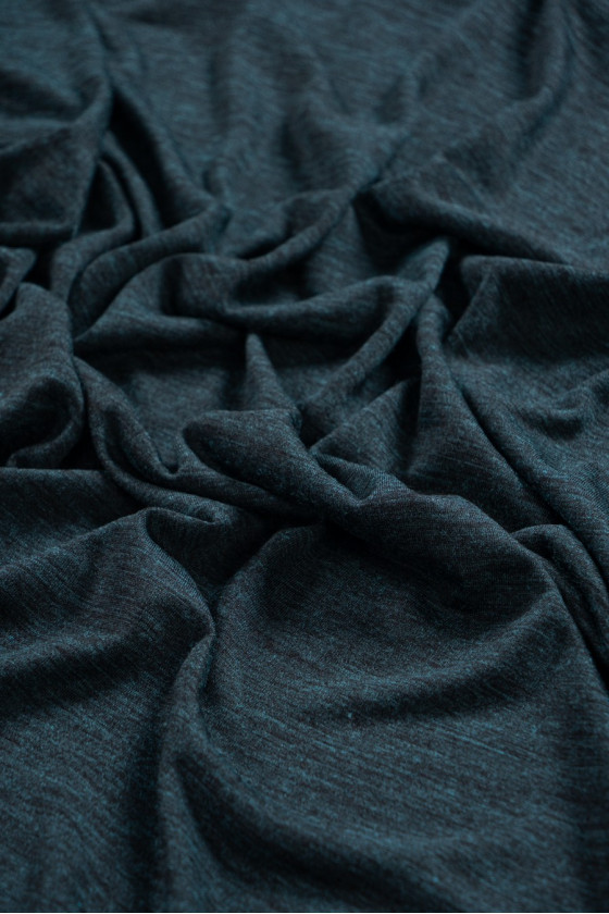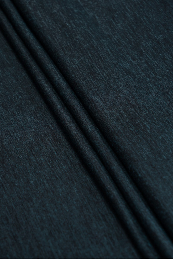 Italiensk sort og havblå sweater strikket stof - meleret, vævet af naturlig uld med en blanding af akryl. Tynd, let gennemsigtig, behagelig at røre ved, perfekt til syning af en sweater eller bluse.