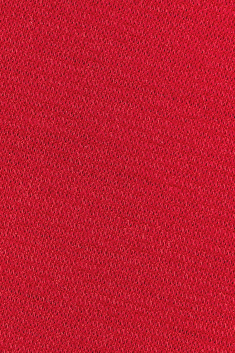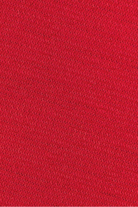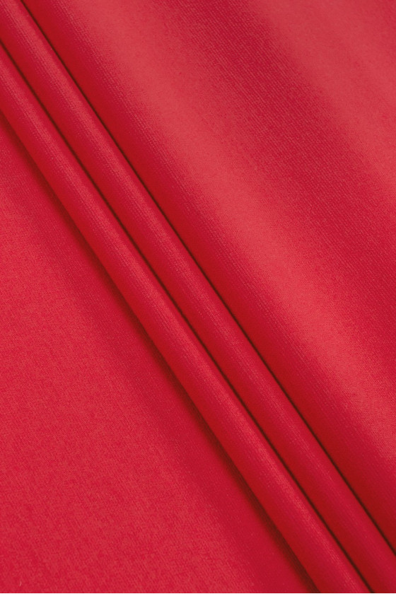 Koralfarvet jerseystof. Vævet stof af 74% polyester, 20% viskose, 6% elastan. Vægten af det strikkede stof er 260g/m2.
