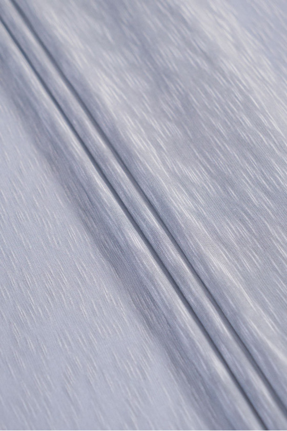 Italiensk viskose strikket stof i gråblå (melange) - meget god kvalitet. En interessant vævning, der ligner linned. Kødfulde, elastiske med en let glans. Perfekt til at sy en bluse eller t-shirt. Krympning +- 10%