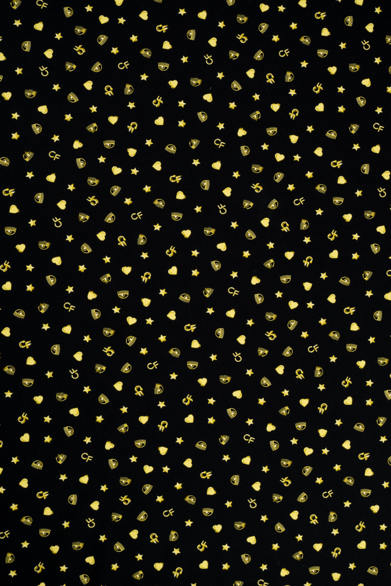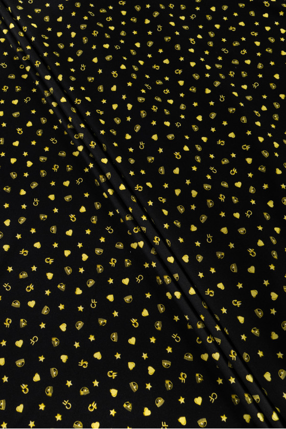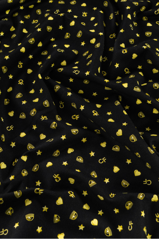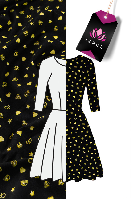 Italiensk sweatshirtstof i sort med et motiv af gule hjerter og stjerner - signeret med logoet for en velkendt modedesigner. Mellemtykt strikket stof, elastisk - børstet. Perfekt til syning af en sweatshirt, bukser, kjole eller træningsdragt.
