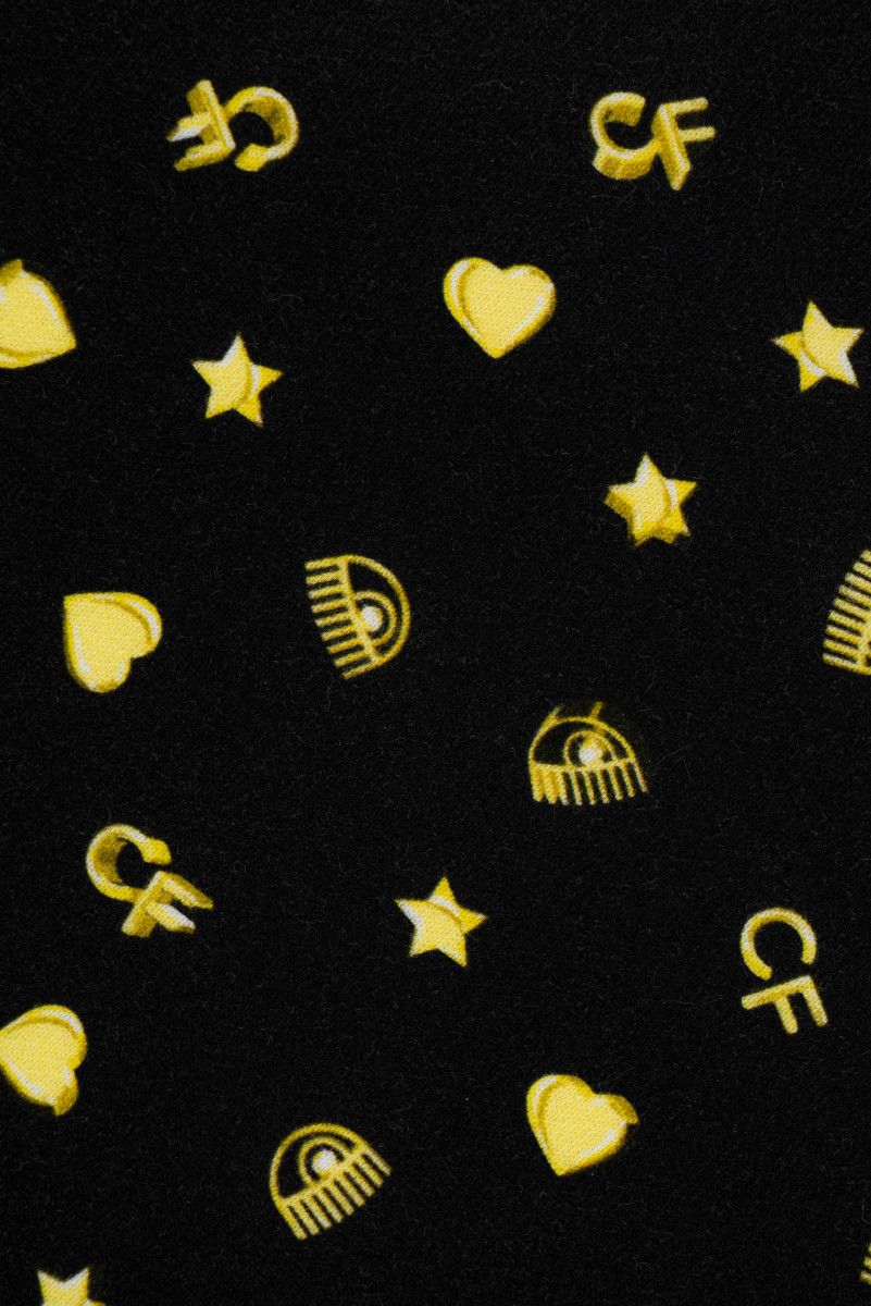 Italiensk sweatshirtstof i sort med et motiv af gule hjerter og stjerner - signeret med logoet for en velkendt modedesigner. Mellemtykt strikket stof, elastisk - børstet.