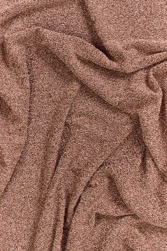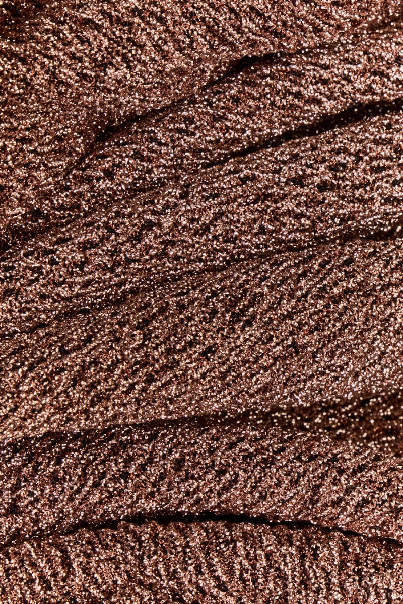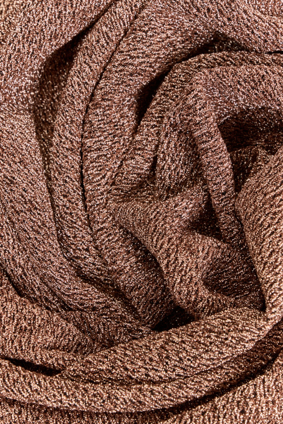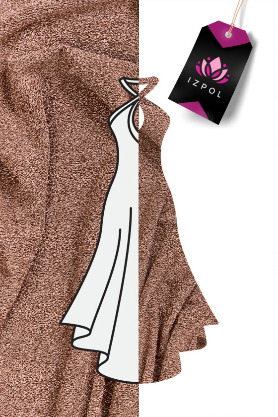 Italiensk mørkeguld polyester strikket stof med en georgette vævet lurex tråd. Stoffet er let elastisk, uigennemsigtigt, meget effektivt, den gyldne tråd skaber en let konveks struktur. Et ideelt forslag til bluser, kjoler, nederdele af en udflugt og scenekarakter.